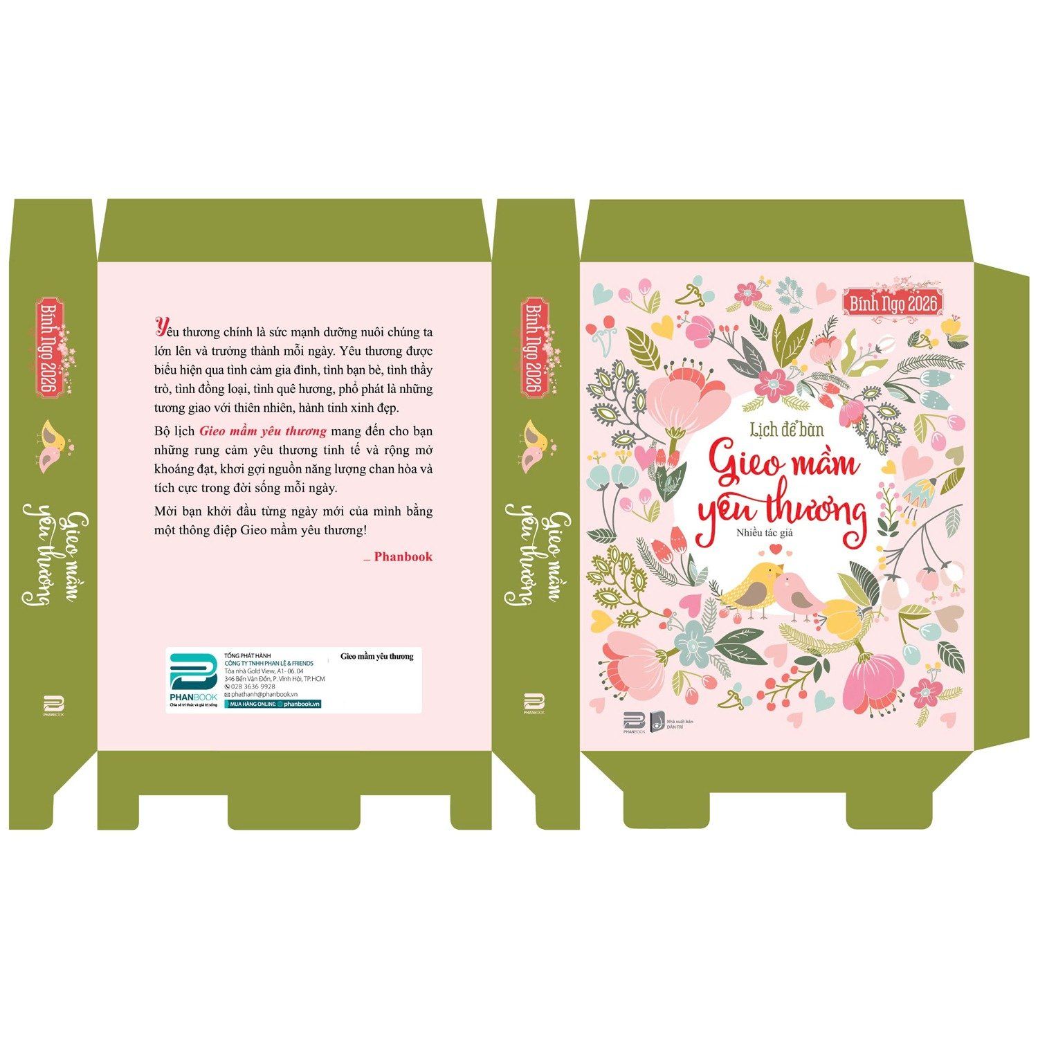 Yêu thương chính là sức mạnh dưỡng nuôi chúng ta lớn lên và trưởng thành mỗi ngày. Yêu thương được biểu hiện qua tình cảm gia đình, tình bạn bè, tình thầy trò, tình đồng loại, tình quê hương và phổ phát, là những tương giao với thiên nhiên, hành tinh xinh đẹp. Bộ lịch Gieo mầm yêu thương mang đến cho bạn những rung cảm yêu thương tinh tế và rộng mở khoáng đạt, khơi gợi nguồn năng lượng chan hòa và tích cực trong đời sống mỗi ngày.