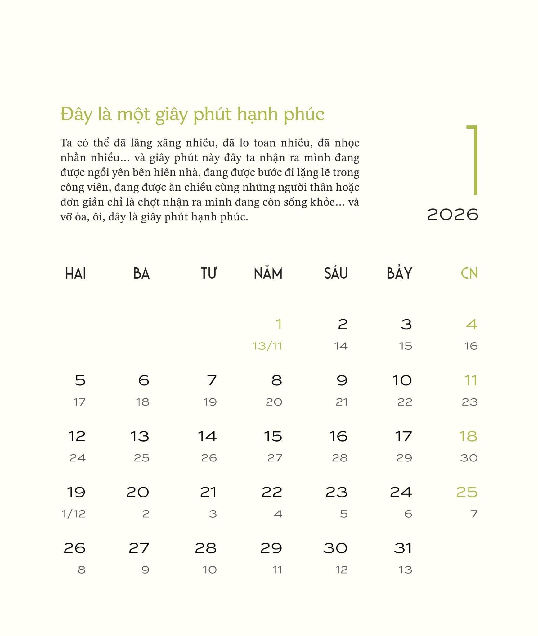 Bộ lịch gồm 12 thông điệp thư pháp nhẹ nhàng, sâu sắc từ Thiền sư Thích Nhất Hạnh như: Thở đi con, thở thật sâu thật chậm, không sao đâu; Lắng nghe; Con về nương tựa đất Mẹ; Lòng hôm ấy sẽ là lòng muôn thuở; Đây là một giây phút hạnh phúc…kết hợp cùng tranh hoa sen của hoạ sĩ Trịnh Lữ – biểu tượng của giác ngộ và thanh tịnh, nở lên từ lòng đất, như nhắc ta: hạnh phúc và hiểu biết có thể bắt đầu từ chính nơi ta đang đứng.