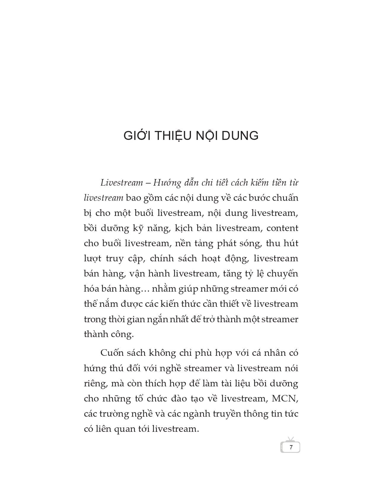 Cuốn sách không chỉ phù hợp với cá nhân có hứng thú đối với nghề streamer và livestream nói riêng, mà còn thích hợp để làm tài liệu bồi dưỡng cho những tổ chức đào tạo về livestream, MCN, các trường nghề và các ngành truyền thông tin tức có liên quan tới livestream.