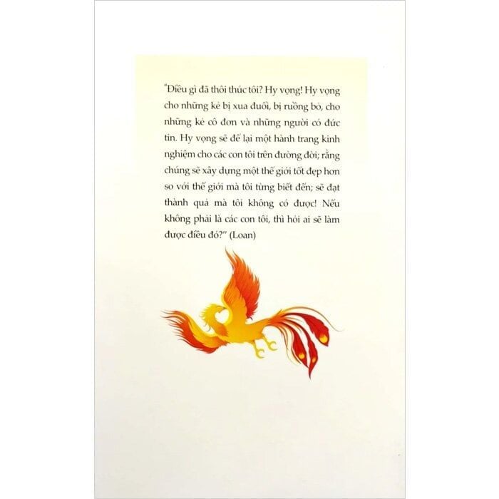 Mở đầu tác phẩm, Tác giả Isabelle đã định nghĩa về mẹ và dành một tình cảm lớn cho người mẹ Việt Nam của mình thật xúc động: “Mẹ” là từ để chỉ người mẹ trong tiếng Việt, “Loan” có nghĩa là “chim Phượng Hoàng”. Suốt đời con vẫn gọi mẹ là “Mẹ Loan”, như mẹ đã dạy cho con và bốn anh chị em con. Sẽ chẳng ai nghĩ đến việc gọi mẹ bằng một cái tên khác. Tên thật của mẹ như thế nào và vì sao mẹ lại từ bỏ nó thì chỉ mỗi mình con biết, và cũng mãi sau nhiều năm trời. Một cảm giác kỳ lạ xâm chiếm tâm hồn con khi hôm nay con viết những dòng này, khi mẹ không còn nữa, nhưng lại hiện hữu hơn bao giờ hết. Mẹ đã giao cho con nhiệm vụ viết về mẹ; về cuộc đời của mẹ như một người đàn bà, như là mẹ của con, về con chim Phượng Hoàng mà mẹ là hiện thân từng bị thiêu cháy nhiều lần, và mỗi lần lại trỗi dậy từ đám tro tàn”.