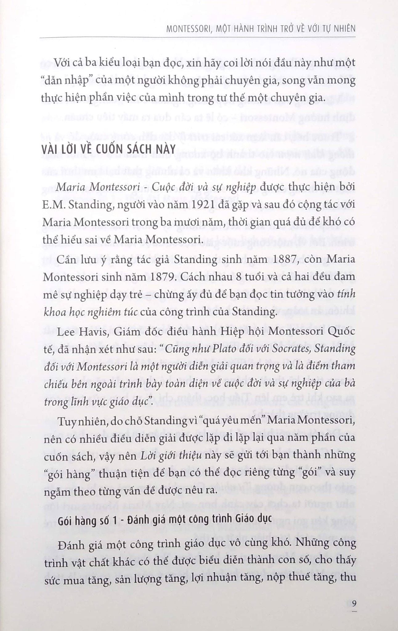 Từ một bác sĩ tâm thần chuyên giúp đỡ những trẻ em chậm phát triển trí tuệ, một cơ duyên tình cờ đã đưa bà đến với sự nghiệp giáo dục trẻ thơ và bản thân bà đã không ngừng khám phá, nghiên cứu và tự hoàn thiện một triết lý giáo dục: hãy tôn trọng trẻ em và tìm cách cư xử với trẻ em một cách tự nhiên nhất có thể. Tác giả Standing ví khám phá của Maria Montessori cũng vĩ đại ngang với Columbus khám phá ra châu Mỹ. Chỉ có điều, thế giới mà Columbus khám phá ra là bên ngoài; còn Montessori đã khám phá ra một thế giới bên trong – bên trong tâm hồn của trẻ em. Xin đừng hiểu lầm về điều này; nó là một khám phá thiên tài về một thứ cũng khách quan như Châu Mỹ đối với Columbus, như Luật Hấp dẫn đối với Newton. Thật sự thì khám phá này mới là thứ đem lại sự nổi tiếng cho bà chứ không phải phương pháp dạy trẻ của bà. Maria Montessori đã khám phá thấy những phẩm chất bình thường của trẻ em cho đến nay vẫn bị che giấu dưới vỏ bọc là những lệch lạc. Maria Montessori đã khám phá ra rằng trẻ em có những phẩm chất khác biệt và cao hơn những gì chúng ta thường gán cho các em.