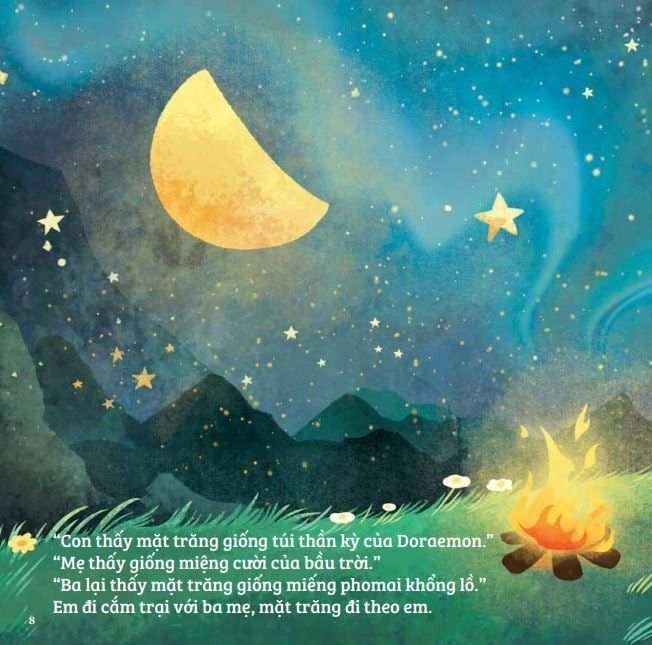 Khi em đi cắm trại với ba mẹ, mặt trăng đi theo em.