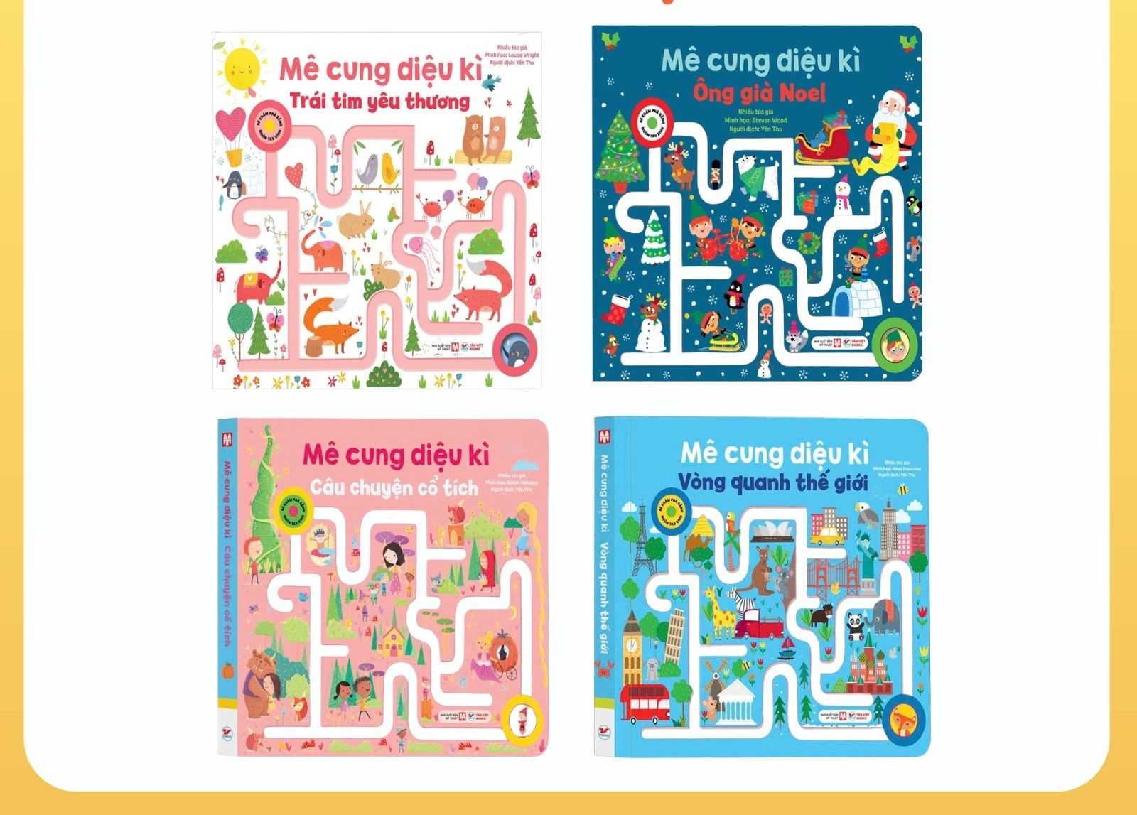 Hơn thế nữa, bộ sách Mê cung diệu kì này còn đưa các bé đến với những lâu đài nguy nga, tráng lệ để gặp gỡ hoàng tử và các nhân vật cổ tích khác như nàng Bạch Tuyết, nàng Tiên Cá, cô bé Lọ Lem… Hay theo chân ông già Noel tham gia vào hành trình phiêu lưu vòng quanh thế giới để mang những món quà Giáng Sinh đến với các bạn nhỏ đáng yêu; hoặc đi tìm một nửa yêu thương cho các bạn động vật nhỏ để thế giới này luôn tràn ngập tiếng cười, tình yêu thương và niềm hạnh phúc,…