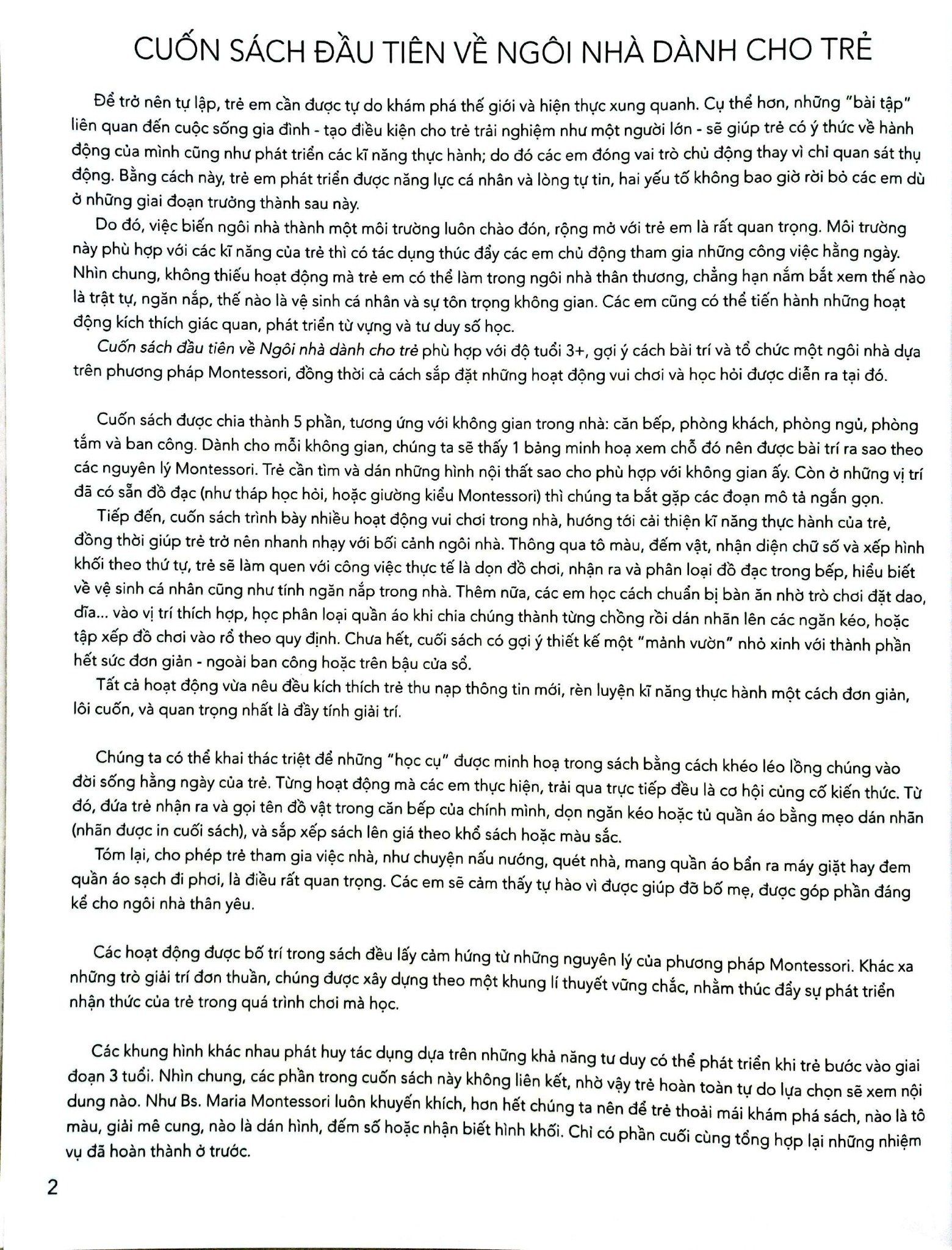 Cuốn sách đầu tiên về Ngôi nhà dành cho trẻ phù hợp với độ tuổi 3+, gợi ý cách bài trí và tổ chức một ngôi nhà dựa trên phương pháp Montessori, đồng thời cả cách sắp đặt những hoạt động vui chơi và học hỏi được diễn ra tại đó.