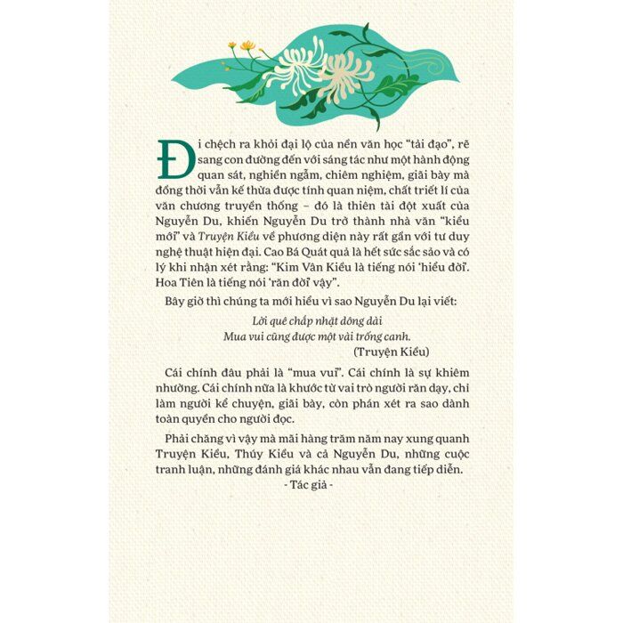“Ði chệch ra khỏi đại lộ của nền văn học “tải đạo”, rẽ sang con đường đến với sáng tác như một hành động quan sát, nghiền ngẫm, chiêm nghiệm, giãi bày mà đồng thời vẫn kế thừa được tính quan niệm, chất triết lí của văn chương truyền thống – đó là thiên tài đột xuất của Nguyễn Du, khiến Nguyễn Du trở thành nhà văn “kiểu mới” và Truyện Kiều về phương diện này rất gần với tư duy nghệ thuật hiện đại. Cao Bá Quát quả là hết sức sắc sảo và có lý khi nhận xét rằng: “Kim Vân Kiều là tiếng nói ‘hiểu đời’. Hoa Tiên là tiếng nói ‘răn đời’ vậy”.