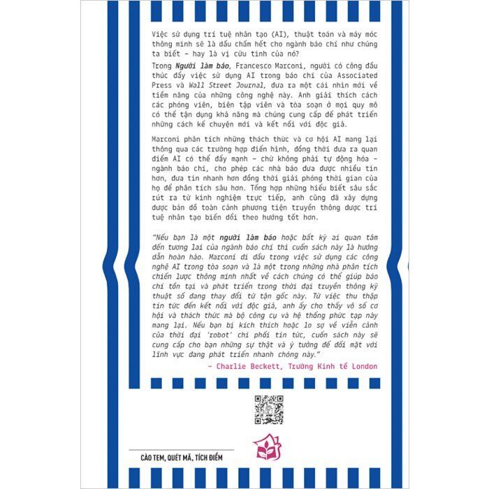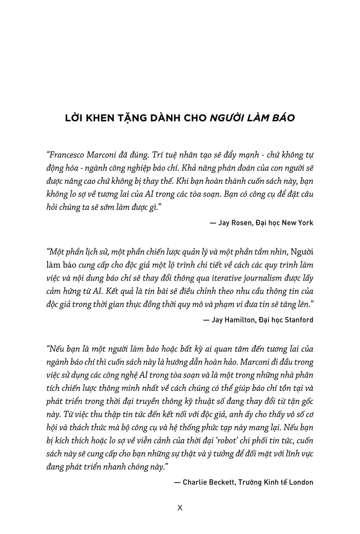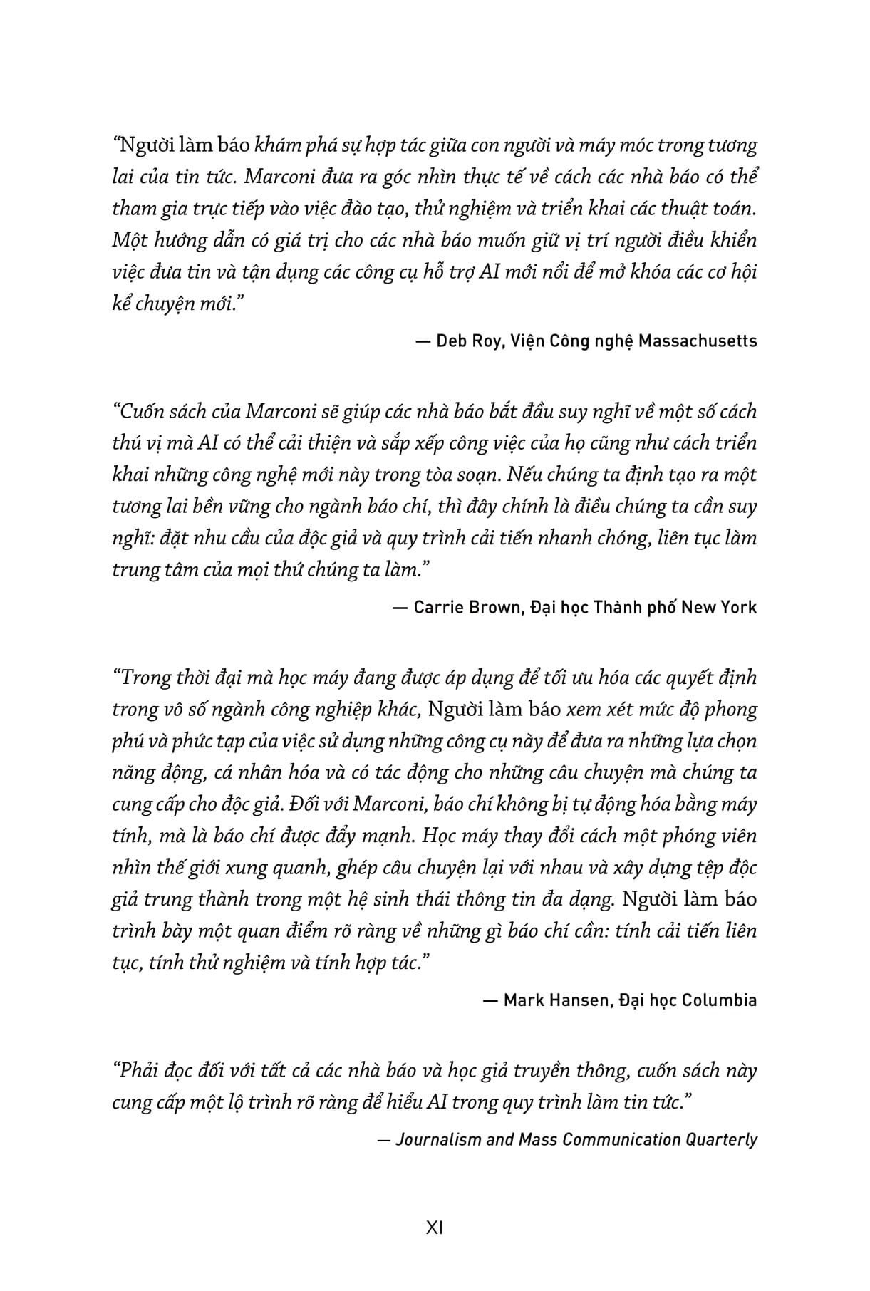 “Nếu bạn là một người làm báo hoặc bất kỳ ai quan tâm đến tương lai của ngành báo chí thì cuốn sách này là hướng dẫn hoàn hảo. Marconi đi đầu trong việc sử dụng các công nghệ AI trong tòa soạn và là một trong những nhà phân tích chiến lược thông minh nhất về cách chúng có thể giúp báo chí tồn tại và phát triển trong thời đại truyền thông kỹ thuật số đang thay đổi từ tận gốc này. Từ việc thu thập tin tức đến kết nối với độc giả, anh ấy cho thấy vô số cơ hội và thách thức mà bộ công cụ và hệ thống phức tạp này mang lại. Nếu bạn bị kích thích hoặc lo sợ về viễn cảnh của thời đại 'robot' chi phối tin tức, cuốn sách này sẽ cung cấp cho bạn những sự thật và ý tưởng để đối mặt với lĩnh vực đang phát triển nhanh chóng này.” - Charlie Beckett, Trường Kinh tế London