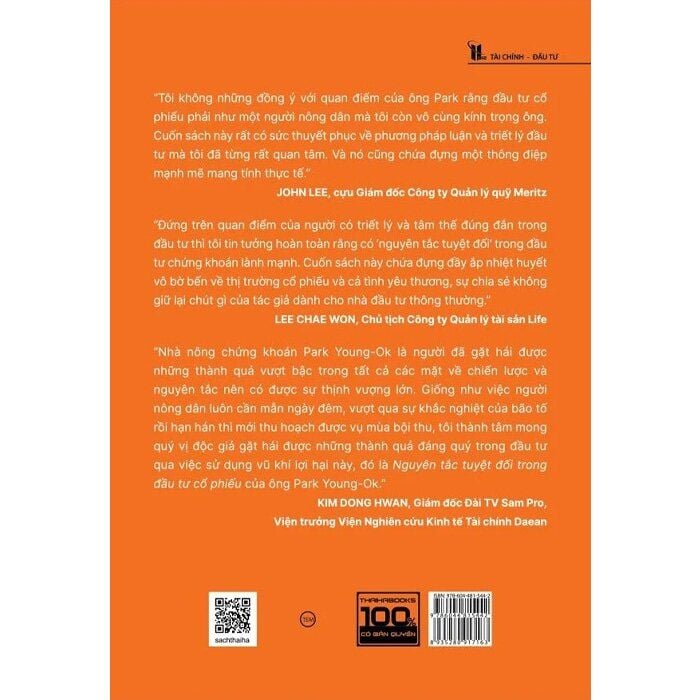 “Đứng trên quan điểm của người có triết lý và tâm thế đúng đắn trong đầu tư thì tôi tin tưởng hoàn toàn rằng có ‘nguyên tắc tuyệt đối’ trong đầu tư chứng khoán lành mạnh. Cuốn sách này chứa đựng đầy ắp nhiệt huyết vô bờ bến về thị trường cổ phiếu của tác giả và cả tình yêu thương, sự chia sẻ không tiếc nuối dành cho nhà đầu tư thông thường.” - LEE CHAE WON, Chủ tịch Công ty Quản lý tài sản Life