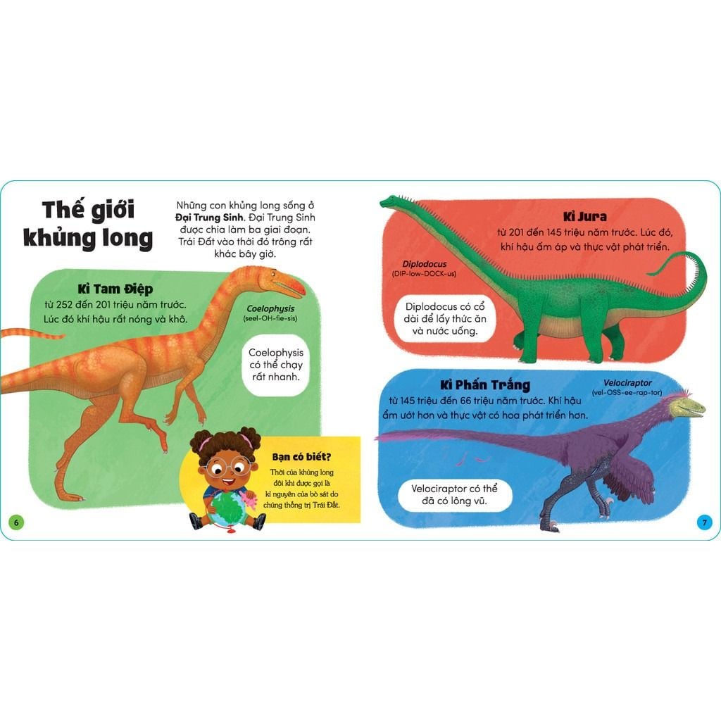 Đối với các độc giả nhí vẫn luôn tò mò về thế giới đầy bí ẩn của những chú khủng long, cuốn sách thú vị này sẽ không làm các bé thất vọng. Cuốn sách giới thiệu mọi thứ từ khủng long sống trong giai đoạn nào, chúng trông như thế nào, chúng ăn gì đến vì sao khủng long lại tuyệt chủng. Phụ huynh hãy cùng bé mở sách và giải đáp những thắc mắc của con trẻ nào!