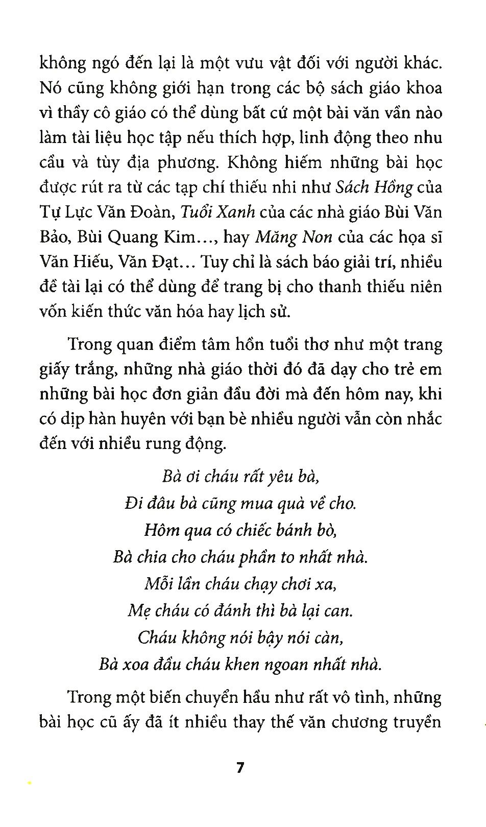 Trong mọi hoàn cảnh, việc sưu tầm, bảo tồn và phổ biến những bài học thuộc lòng đã một thời gắn bó với học sinh bậc tiểu học của Trần Văn Chánh không hạn chế trong một công trình biên khảo hay nghiên cứu như anh đã và đang làm mà còn là một bông hoa thêm vào những tài sản giáo dục rất đáng trân trọng. Trong tinh thần đó, tôi tin rằng những đọc giả khó tính nhất cũng sẽ quan tâm và cảm phục, và xin có mấy lời đề từ như một cách giới thiệu thêm tới đông đảo độc giả, đặc biệt đối với sinh viên - học sinh, các thầy cô giáo, và với tất cả những người đang nặng lòng với sự nghiệp giáo dục thế hệ trẻ.
