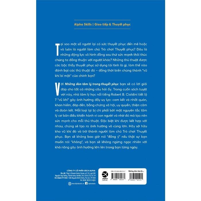 Với Những Đòn Tâm Lý Trong Thuyết Phục, bạn sẽ có lời giải đáp cho tất cả những câu hỏi ấy. Trong Những Đòn Tâm Lý Trong Thuyết Phục, nhà tâm lý học nổi tiếng Robert B. Cialdini tiết lộ 6 ""vũ khí"" gây ảnh hưởng đầy uy lực: cam kết và nhất quán, khan hiếm, đáp trả, bằng chứng xã hội, uy quyền và thiện cảm. Mỗi loại lại bị chi phối bởi một nguyên tắc tâm lý cơ bản điều khiển hành vi con người và nhờ đó mà tạo nên sức mạnh cho mỗi thủ thuật. Đặc biệt khi được kết hợp với nhau, chúng sẽ tạo ra ảnh hưởng vô cùng lớn.