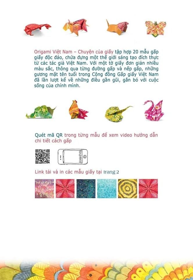 Origami Việt Nam - Chuyện của giấy tập hợp 20 mẫu gấp giấy độc đáo, chứa đựng một thế giới sáng tạo đích thực từ các tác giả Việt Nam. Với một tờ giấy đơn giản nhiều màu sắc, thông qua từng đường gấp và nếp gấp, những gương mặt tên tuổi trong Cộng đồng Gấp giấy Việt Nam đã lần lượt kể về những điều gần gũi, gắn bó với cuộc sống của chính mình.