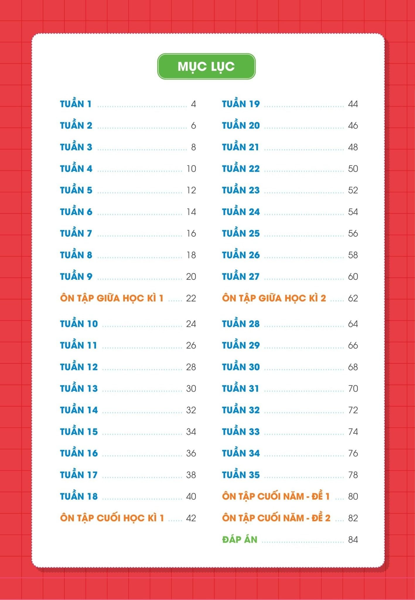 Bộ sách gồm các bài luyện tập chia theo tuần, ôn tập tổng quát kiến thức của 35 tuần học. Ngoài ra, cuốn sách cũng cung cấp các bài kiểm tra giữa kỳ và cuối kỳ để các con trau dồi thêm, tự tin chinh phục điểm cao trong các bài kiểm tra trên lớp.