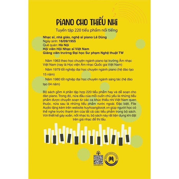 Cuốn Piano Cho Thiếu Nhi - Tuyển Tập 220 Tiểu Phẩm Nổi Tiếng gồm 4 tập, chọn lọc những tiểu phẩm hay, nổi tiếng soạn riêng cho đàn piano giúp những bạn yêu thích âm nhạc, đặc biệt là các em thiếu nhi luyện tập. Đặc biệt với 220 tiểu phẩm này, các em cũng có thể luyện tập trên đàn Organ.