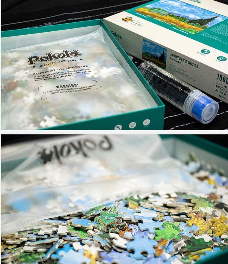 Một bộ hoàn chỉnh bao gồm các phụ kiện đi kèm: Hộp sản phẩm, một túi đựng các mảnh ghép, giấy hướng dẫn, tấm thảm lót puzzle, keo trong suốt, và hình ảnh để đối chiếu lúc xếp hình.