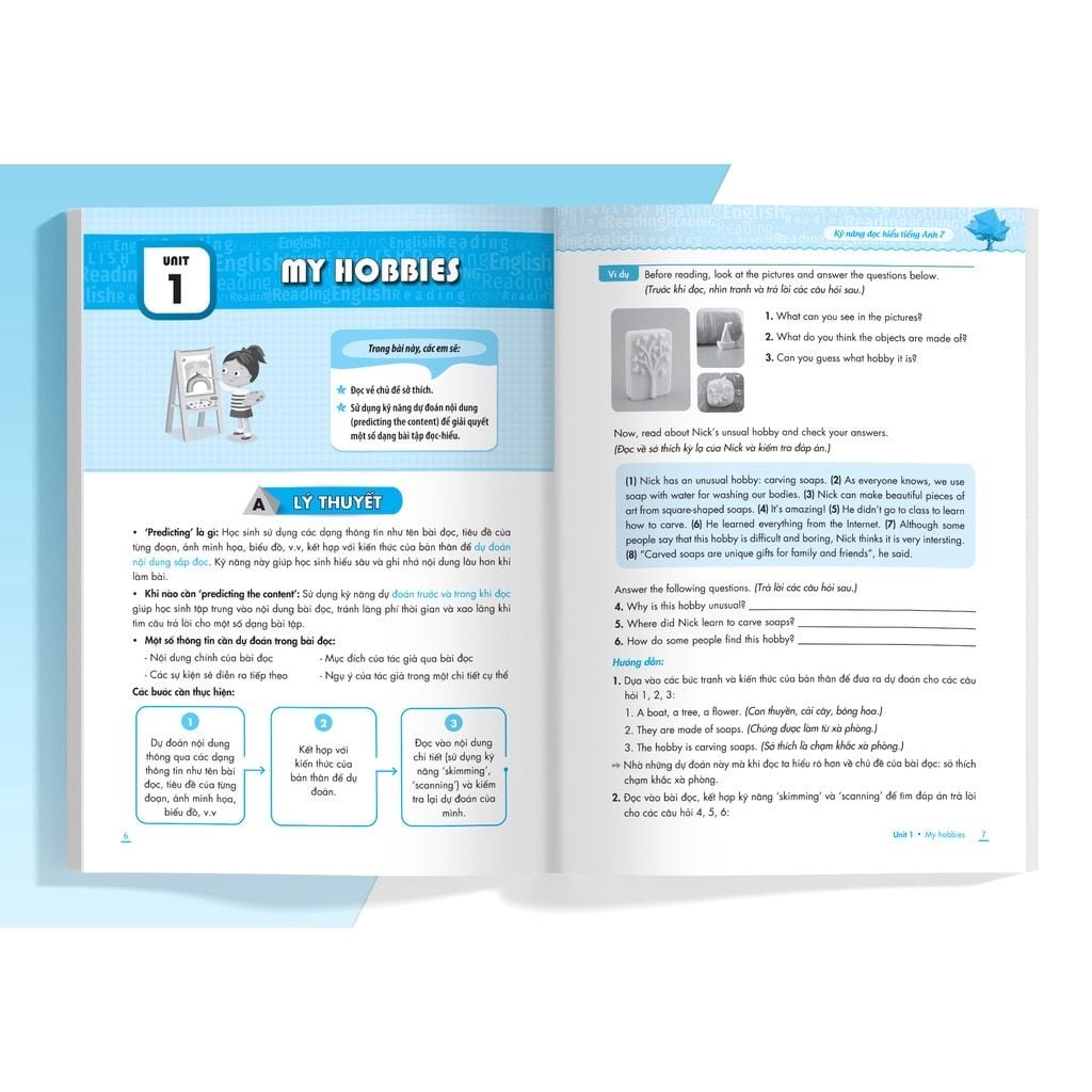 Giới thiệu các kỹ năng đọc hiểu lồng ghép vào chủ đề bài học, có hướng dẫn từng bước cụ thể, giúp học sinh dễ dàng ghi nhớ và vận dụng.