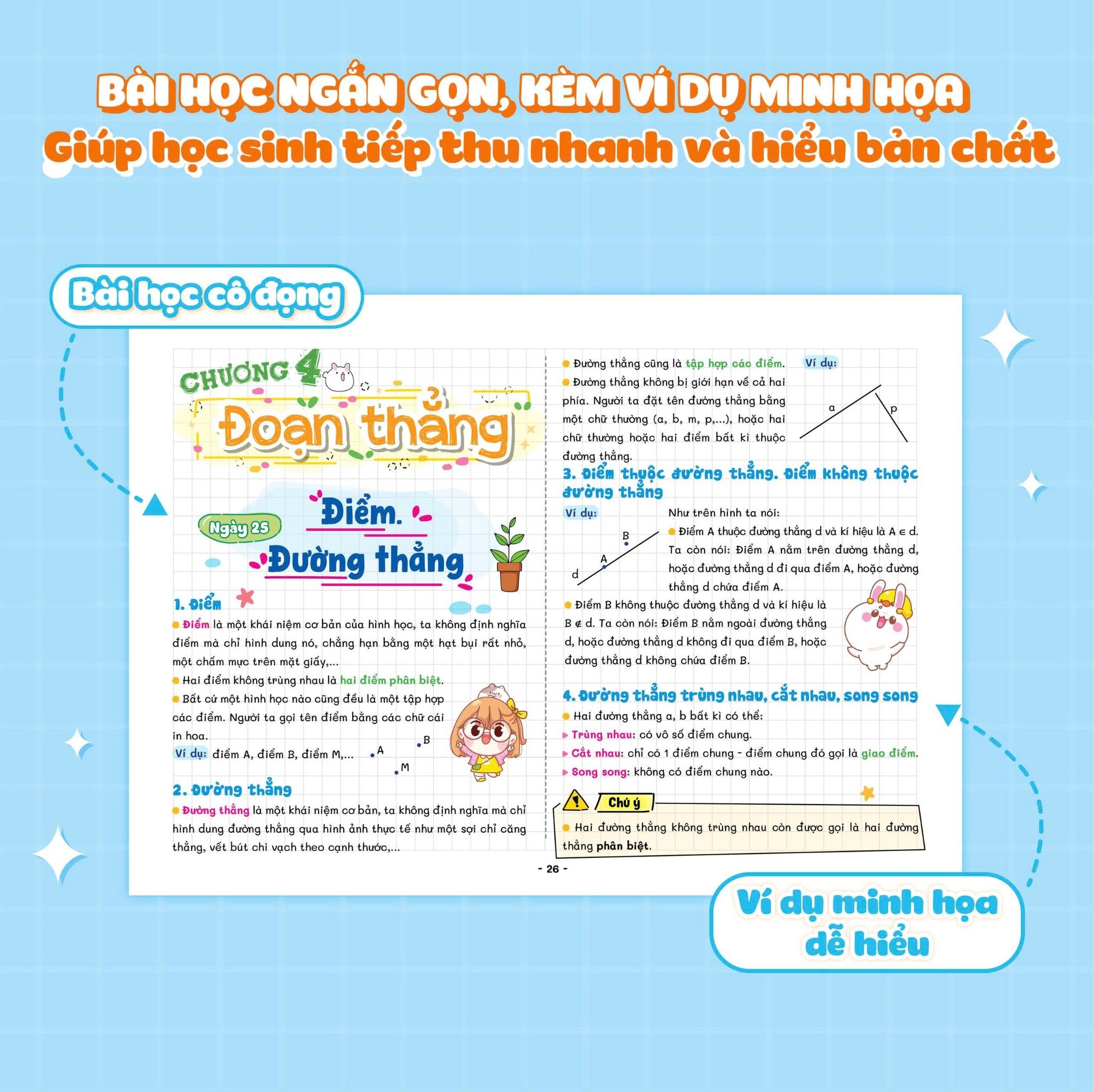 - Ôn đúng trọng tâm – bám sát chương trình: Sách bám sát nội dung chương trình mới Toán lớp 6, các chủ đề đều được sắp xếp theo lộ trình chuẩn, giúp học sinh học đâu chắc đó, không lan man. Nhờ đó, các bạn dễ dàng nắm vững nền tảng và tự tin đạt điểm cao trong các bài kiểm tra và kỳ thi.