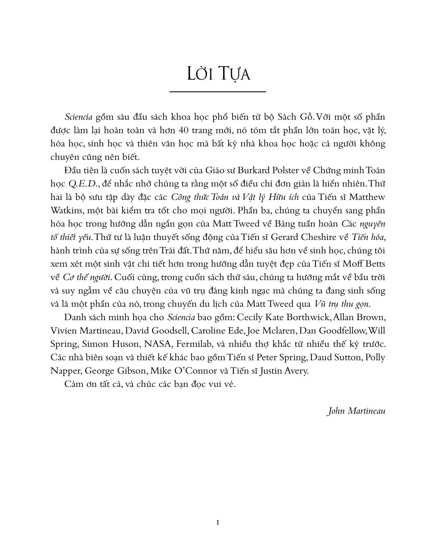 Sciencia - Toán học, Vật lý, Hóa học, Sinh học, và Thiên văn học là một cuốn sách đại chúng và cũng khá đặc biệt. Nó là một dạng sổ tay cho học sinh, nhưng đôi khi có giải thích vắn tắt một số bước tiến khoa học hay ý nghĩa của chúng. Cũng có những phần rất “gợi cảm hứng trí tuệ”. Đơn cử như phần về “hoàn vũ cân chỉnh” (A finely tuned Universe): Nếu lực trọng trường tăng thêm chỉ 0,1% thì vũ trụ sẽ đầy rẫy những lỗ đen, nếu nó yếu hơn 0,1% thì các thiên hà sẽ không hình thành được; Nếu Big Bang tỏa năng lượng ít hơn thì vũ trụ sẽ bị sụp, nhiều hơn thì các ngôi sao không hình thành được. Mọi thứ đều như được sắp đặt để hoàn vũ như ngày nay tồn tại (như thể có sự sắp đặt của Thượng đế vậy, và thật ra thì con người cũng thế). Sciencia bao hàm một nền tảng khoa học hoàn chỉnh cho cả học sinh lẫn những ai yêu thích các môn tự nhiên, để tìm hiểu, quy nạp và phát triển thêm về đam mê khoa học.