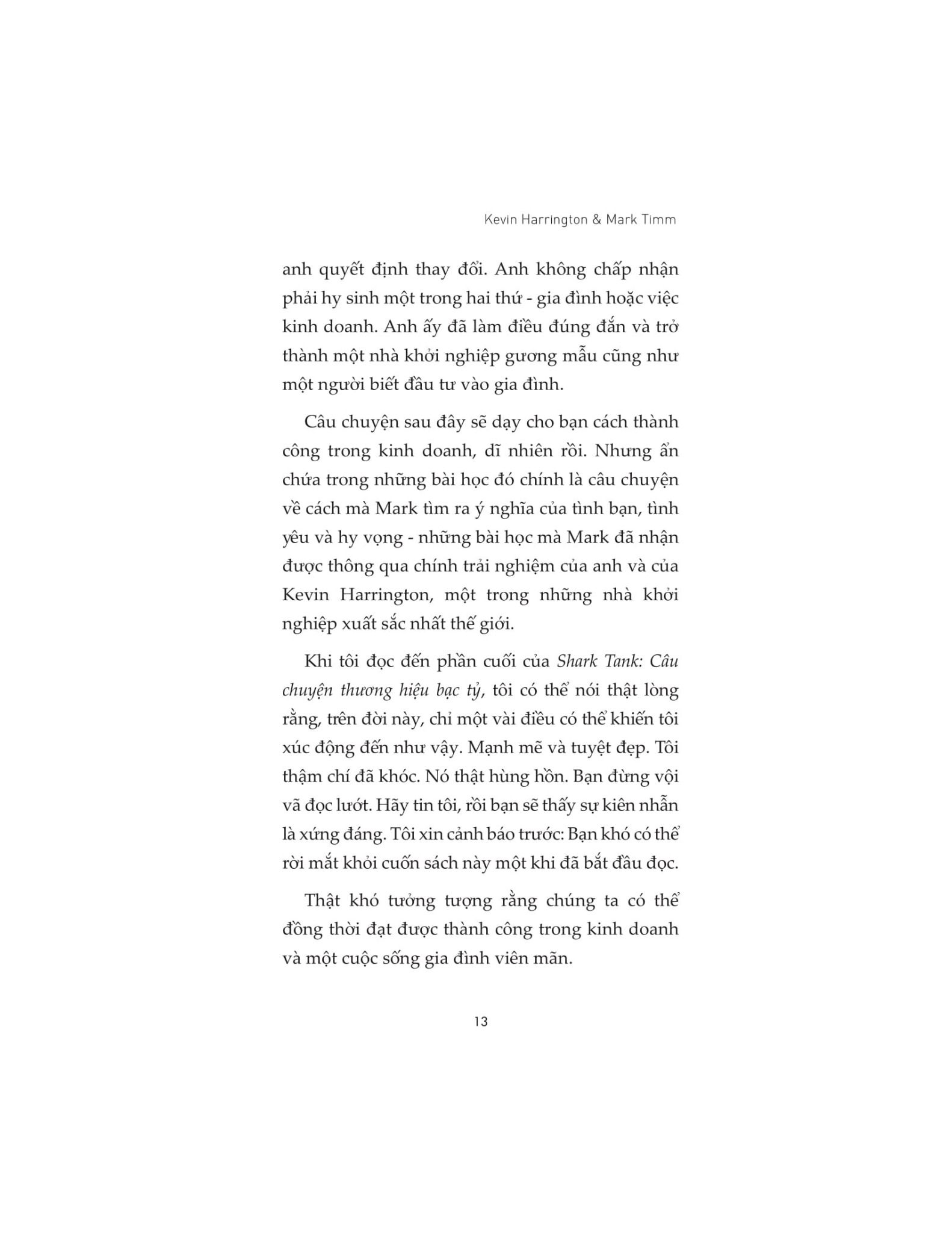 Shark Tank: Câu chuyện thương hiệu bạc tỷ, bộ đôi tác giả Kevin Harrington, một trong những “cá mập” đầu tiên của chương trình ăn khách Shark Tank, và doanh nhân Mark Timm sẽ dẫn dắt độc giả vào một hành trình đầy lôi cuốn, tìm hiểu những ý tưởng kinh doanh và chiến thuật cạnh tranh có khả năng chiếm lĩnh thị trường của những siêu sao khởi nghiệp hàng đầu thế giới.