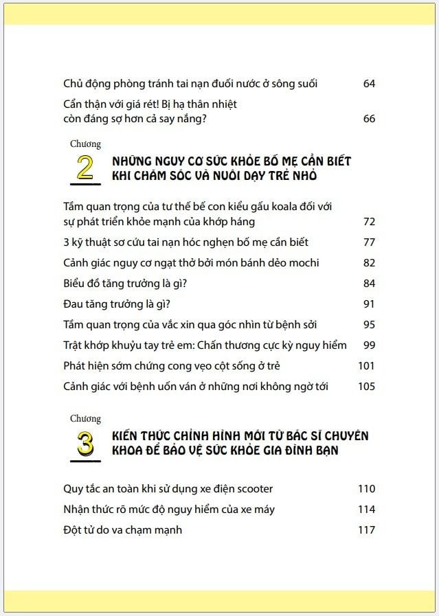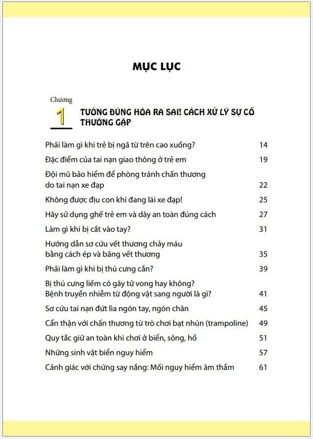 Điểm nổi bật của sách là cách trình bày mạch lạc, dễ đọc, với nhiều tình huống thực tế, từ việc xử lý vết thương chảy máu, sơ cứu khi trẻ bị hóc nghẹn, cho đến phòng tránh tai nạn xe đạp hay nguy cơ từ thú cưng. Những kiến thức này không chỉ dành cho cha mẹ có con nhỏ, mà bất kỳ thành viên nào trong gia đình cũng có thể tham khảo để chủ động bảo vệ mình và người thân.