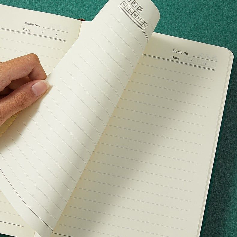 Sổ tay bìa PU chắc chắn, dây cố định sổ, giấy ruột kẻ ngang thuận tiện cho việc ghi chép