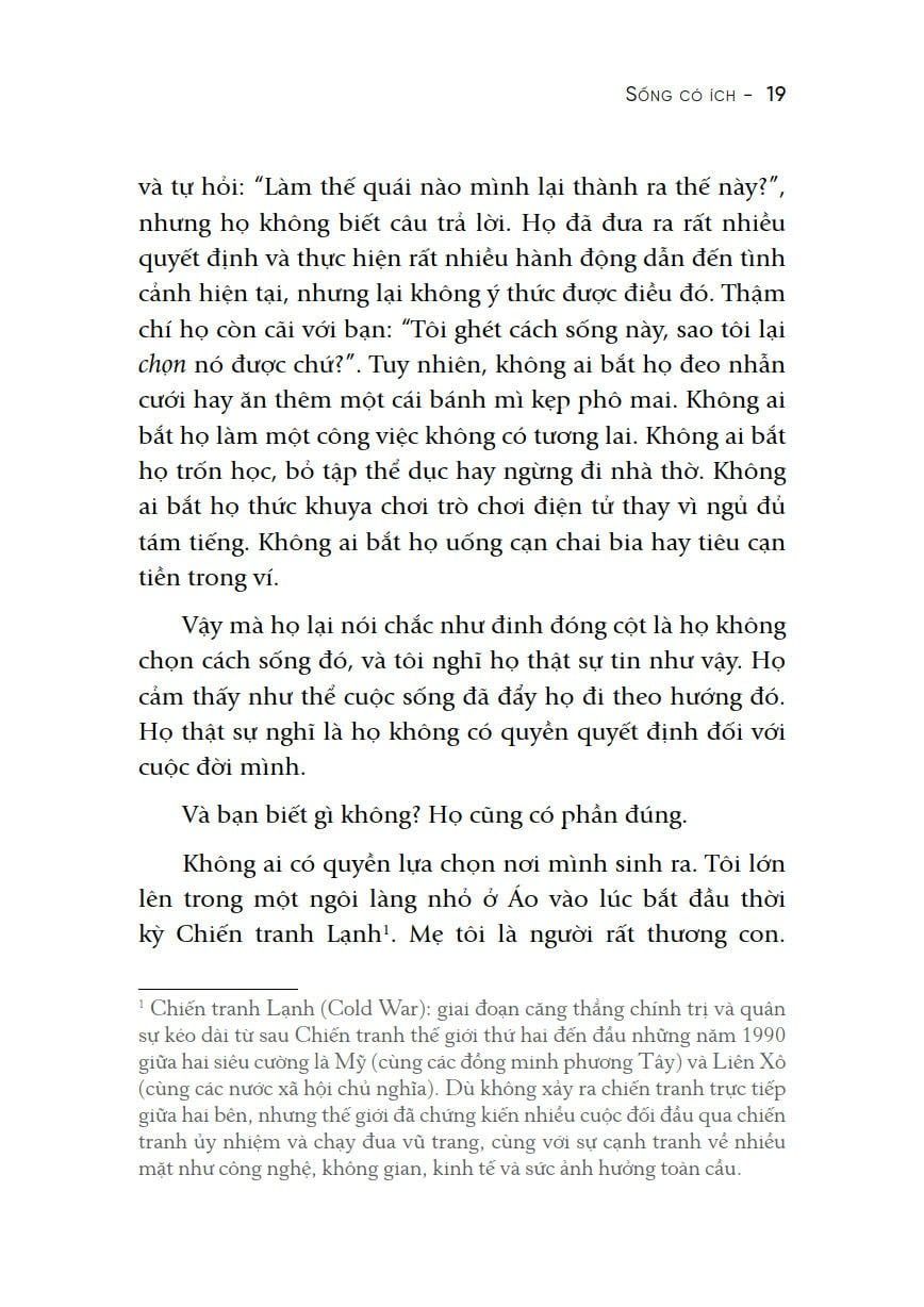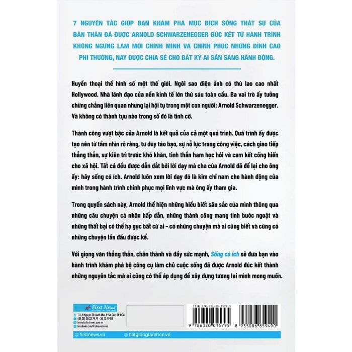 Sống có ích (tựa gốc: Be useful) vừa là tự truyện, vừa là cuốn cẩm nang phát triển bản thân mà Arnold Schwarzenegger đích thân chấp bút. Tạm rời xa ánh hào quang của màn ảnh và chính trường, Arnold ở “hồi bốn của cuộc đời” lựa chọn đồng hành cùng thế hệ trẻ trên hành trình bồi dưỡng ước mơ và trui rèn nghị lực sống.