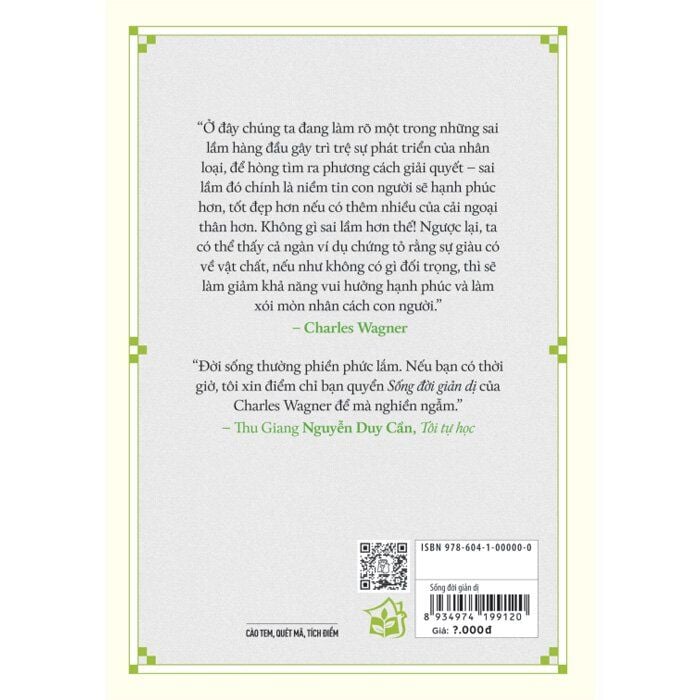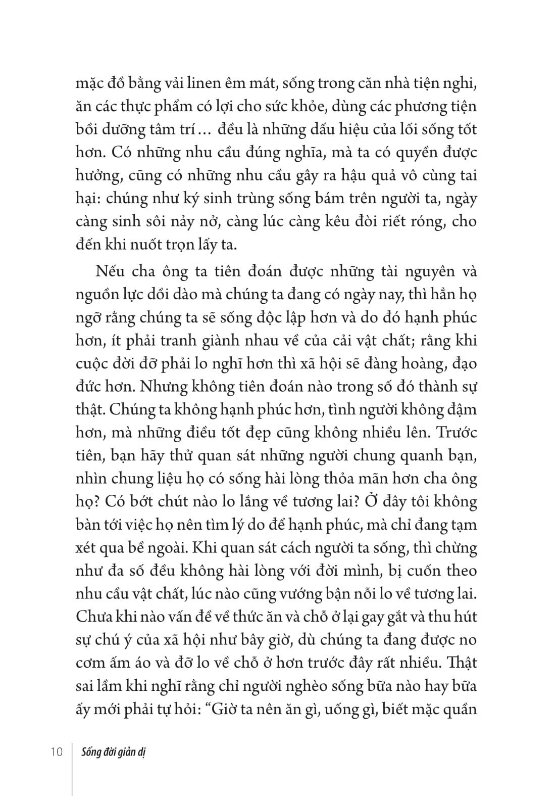 Sống đời giản dị chứa đựng những khám phá của Charles Wagner về giá trị của việc sống giản dị giữa sự phức tạp của xã hội hiện đại. Tác giả ủng hộ việc tổ chức một đời sống giản dị, một đời sống với quan niệm biết chọn lựa những gì là chính yếu và biết bỏ qua những gì là phụ thuộc. Ông khuyến khích độc giả xem xét lại các ưu tiên của mình và nhấn mạnh tầm quan trọng của sự hoàn thiện bên trong hơn là sự giàu có bên ngoài. Bằng cách đó, con người sẽ tìm thấy hạnh phúc, bình yên về mặt tinh thần và cuộc sống của con người cũng sẽ trở nên ý nghĩa hơn.