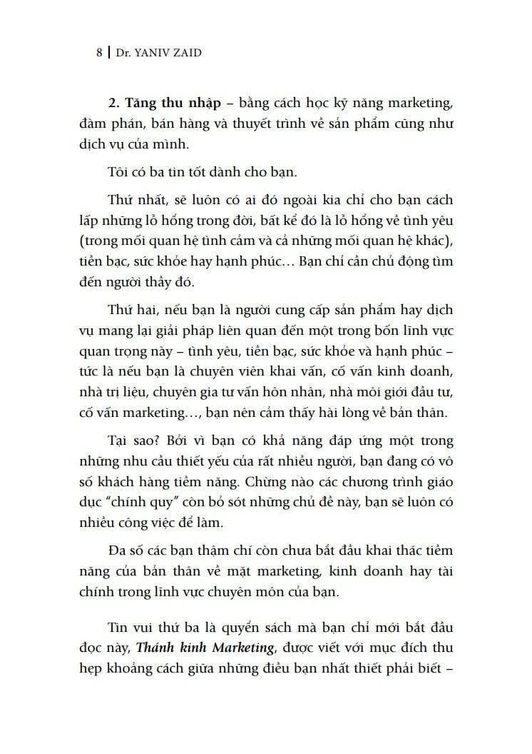 Cuốn sách “Thánh kinh marketing” thu hẹp khoảng cách giữa những điều bạn nhất thiết phải biết về bán hàng, tiếp thị, thuyết phục, đàm phán, thuyết trình và công việc kinh doanh nói chung với những điều bạn được dạy trong môi trường “chính quy”, nhằm giúp bạn phát huy tối đa mọi tiềm năng và đưa bạn tới đỉnh cao của thành công. Tiến sĩ Yaniv Zaid mang đến cho độc giả của ông mười quy tắc vàng trong marketing, thương thuyết và bán hàng, những điều họ cần phải biết trong thế kỷ 21.