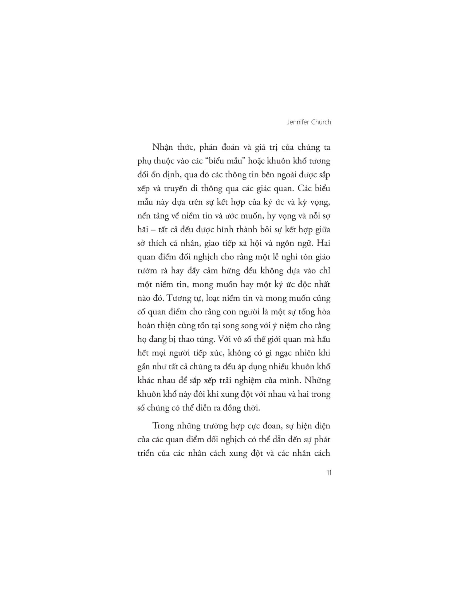Jennifer Church là Giáo sư Danh dự Triết học tại trường đại học Vassar College ở Poughkeepsie, New York. Các nghiên cứu của bà trải dài ở nhiều chủ đề thuộc triết học nhận thức, bao gồm ý thức, tình cảm, phi lí trí, năng lực tri giác và tưởng tượng. Ngoài ra, bà cũng tìm hiểu về Kant, Freud, lí thuyết nữ quyền và triết học về âm nhạc.