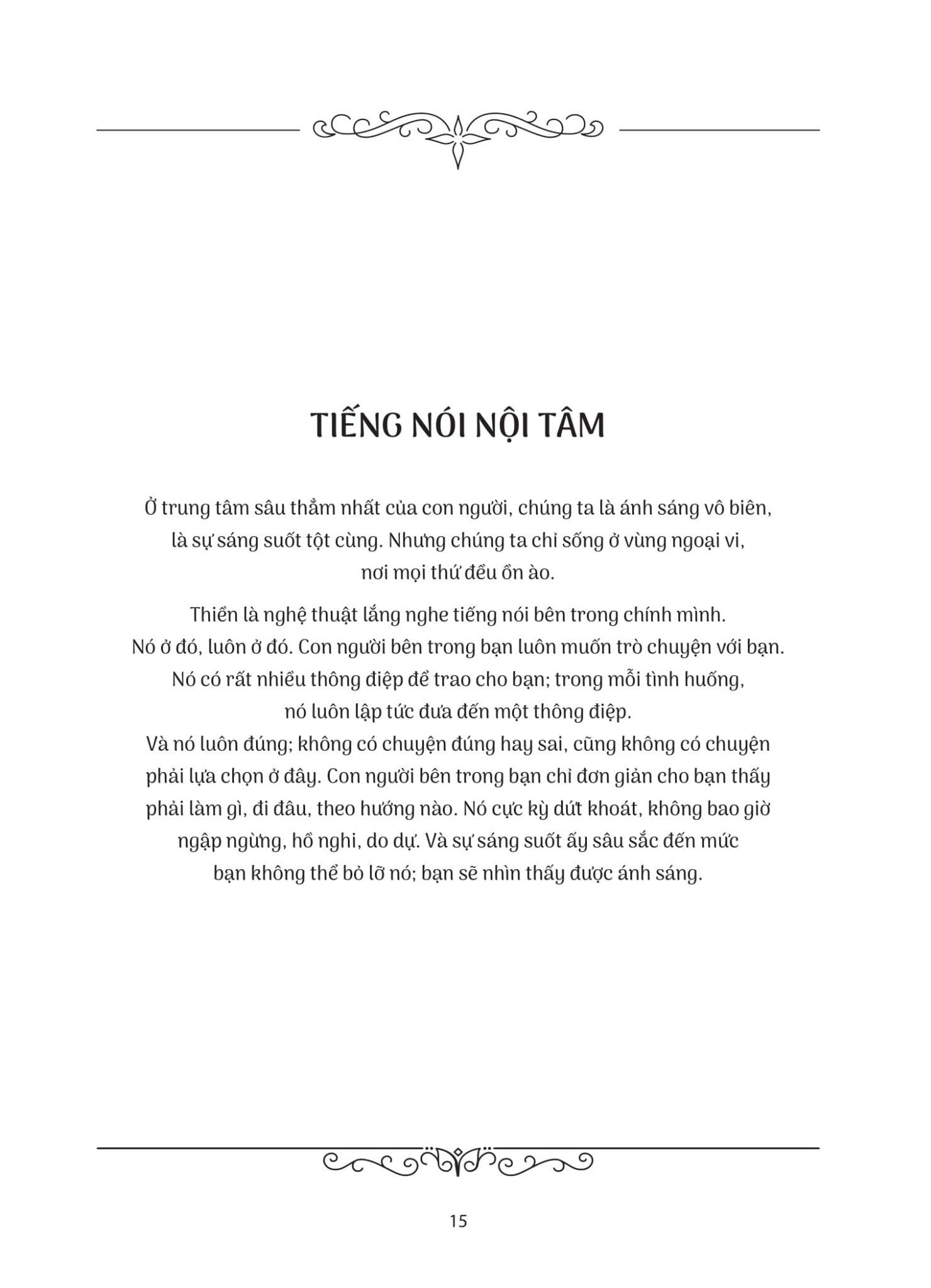 2. Con người bên trong bạn chỉ đơn giản cho bạn thấy phải làm gì, đi đâu, theo hướng nào. Nó cực kỳ dứt khoát, không bao giờ ngập ngừng, hồ nghi, do dự. Và sự sáng suốt ấy sâu sắc đến mức bạn không thể bỏ lỡ nó; bạn sẽ nhìn thấy được ánh sáng. (Trang 15)