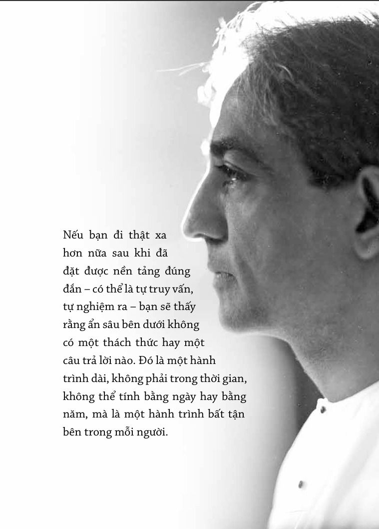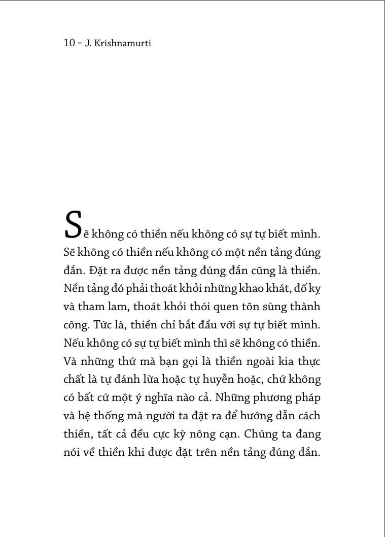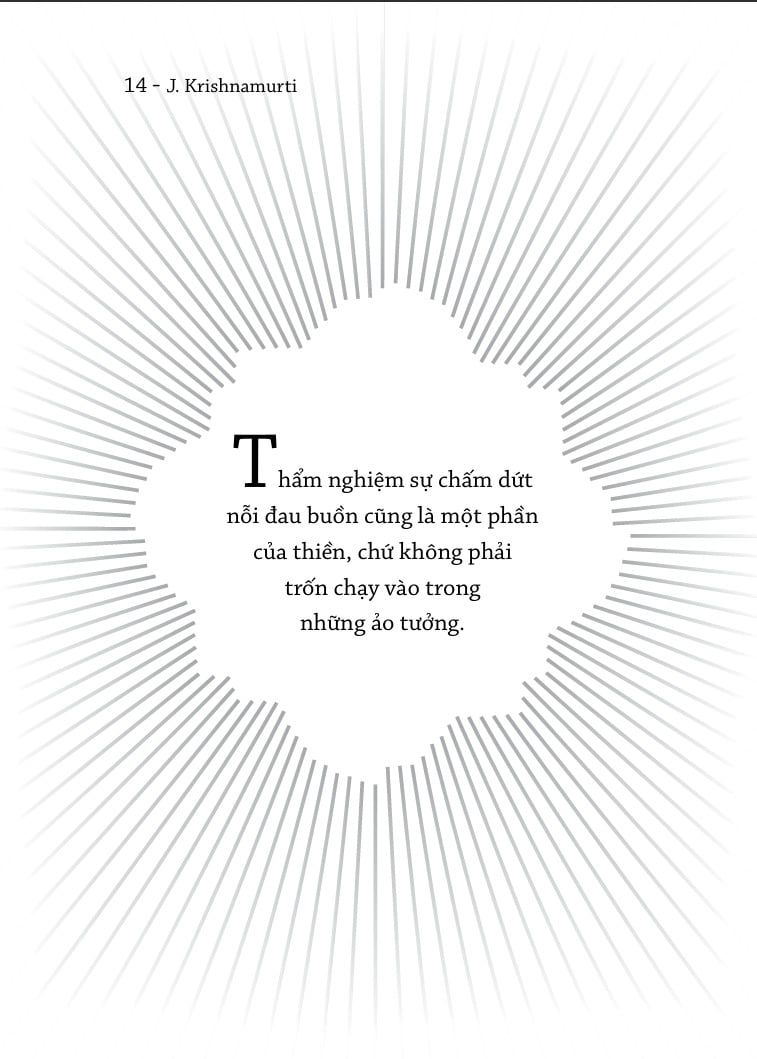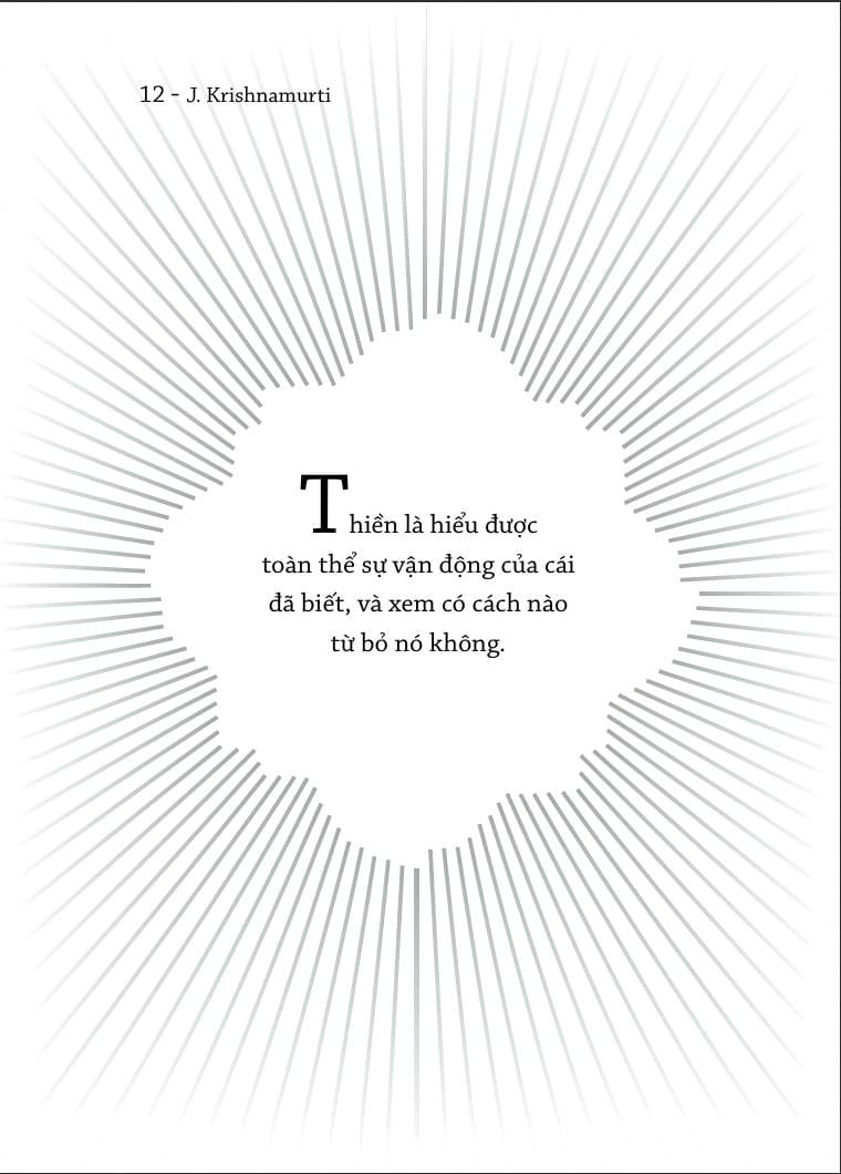 Và quan trọng hơn hết, thiền là sự tự do vượt thoát mọi điều đã biết. “Thiền không phải là tụng niệm những từ ngữ, ngồi trong góc tối, nhìn vào những sự phóng chiếu, hình ảnh và ý niệm của chính mình. Thiền là làm sáng tỏ cái đã biết và tự giải thoát mình khỏi cái đã biết.” Qua mỗi trang, mỗi câu, ta dần dần tự xây dựng cho mình cách hiểu riêng và khai ngộ về thiền.
