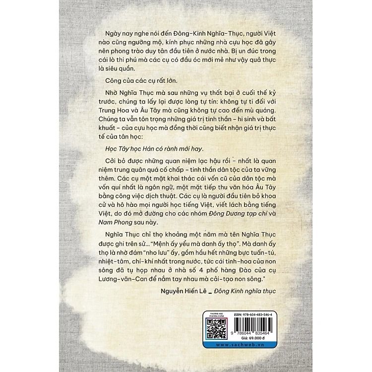 Nhờ Nghĩa Thục mà sau những vụ thất bại ở cuối thế kỷ trước, chúng ta lấy lại được lòng tự tín: không tự ti đối với Trung Hoa và Âu Tây mà cũng không tự cao đến mù quáng. Chúng ta vẫn tôn trọng những giá trị tinh thần - hi sinh và bất khuất - của cựu học mà đồng thời cũng biết nhận giá trị thực tế của tân học: