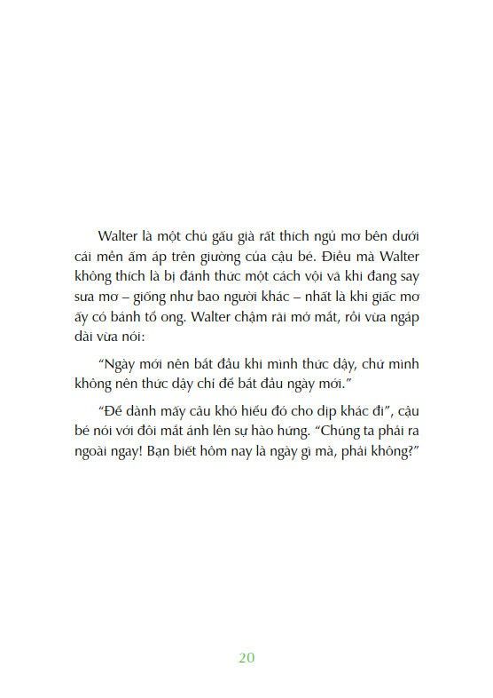 “Nhưng như vậy thì bạn sẽ chẳng bao giờ được tổ chức tiệc ngủ”, Walter nhắc cậu bé. Rồi chú nói thêm bằng giọng khẽ khàng hơn: “Hoặc có một nơi để trở về sau mỗi chuyến phiêu lưu”.