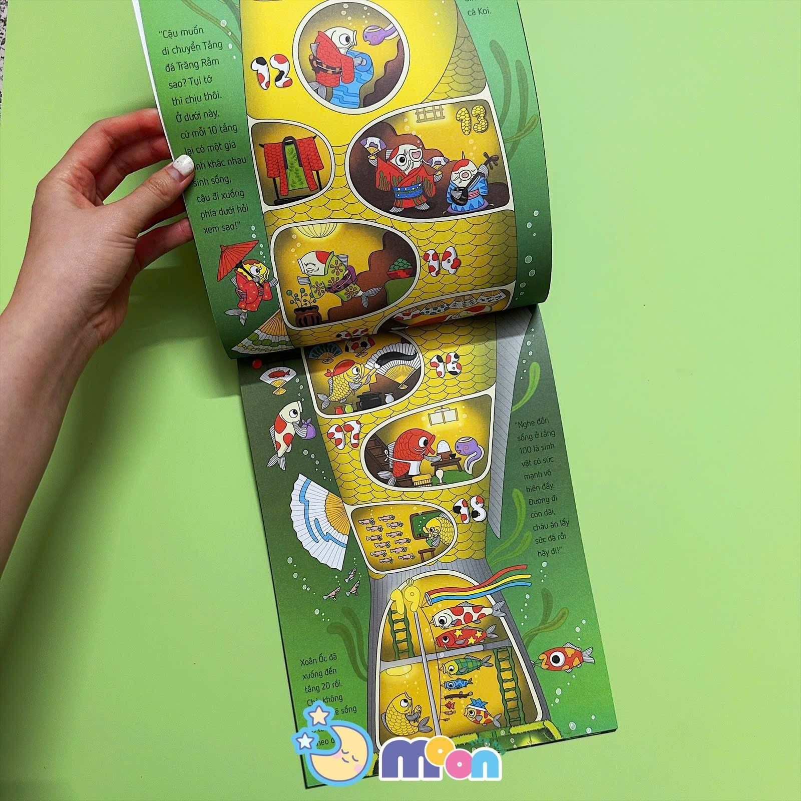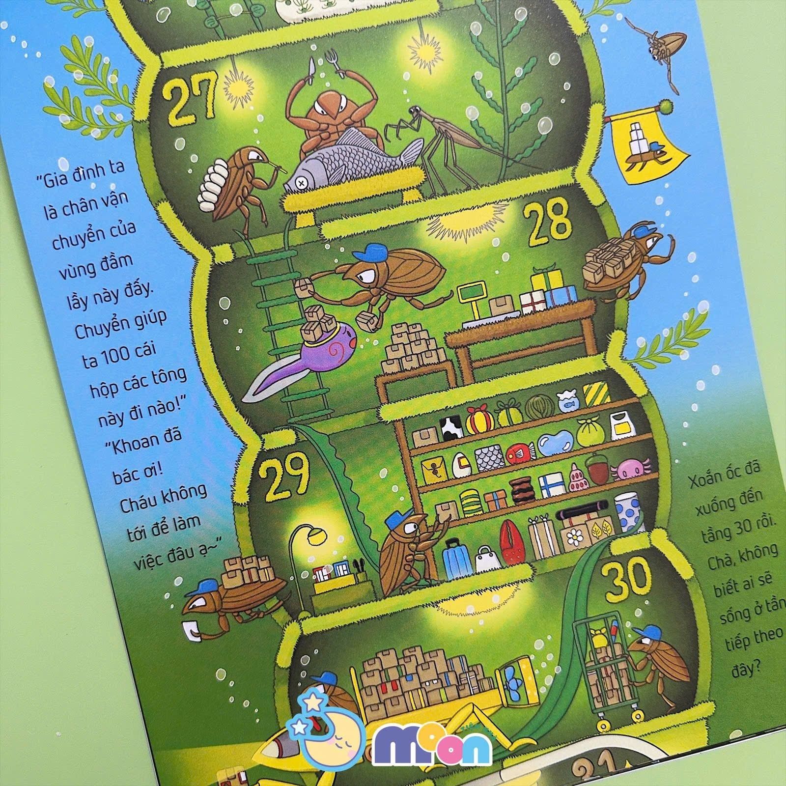 Trên đỉnh núi cao, có một tảng đá khổng lồ mang tên Trăng Rằm. Dưới chân núi, một đầm lầy nhỏ xinh là ngôi nhà của vô vàn chú nòng nọc, trong đó có Xoắn Ốc – chú nòng nọc to lớn, tốt bụng và dũng cảm. Một ngày kia, tảng đá Trăng Rằm siêu to khổng lồ trên đỉnh núi bỗng rơi xuống đầm lầy, đe dọa tiêu diệt mọi sinh vật sống ở đây. Trong cơn nguy cấp, Xoắn Ốc phải vội vã lao đi tìm sự giúp đỡ và tìm thấy một tòa nhà kỳ dị dưới đáy đầm lầy. Cậu đã làm quen với những cư dân độc đáo ở đây và dấn thân vào một cuộc phiêu lưu thú vị. Thế nhưng, trên hành trình xuống tới tầng 100 của tòa nhà, bí mật về thân phận thật sự của Xoắn Ốc dần được hé lộ… Cậu không phải một chú nòng nọc! Vậy, rốt cuộc Xoắn Ốc sẽ là ai nhỉ? Và liệu Xoắn Ốc có tìm được cách cứu đầm lầy khỏi sự đe dọa của tảng đá Trăng Rằm không? Các bé hãy đón đọc cuốn Ehon Nhật Bản Tòa nhà 100 tầng dưới đầm lầy” để tìm ra câu trả lời nhé. Sách dành cho các bạn nhỏ từ 3- 8 tuổi với rất nhiều kiến thức bổ ích và những khám phá bất ngờ.