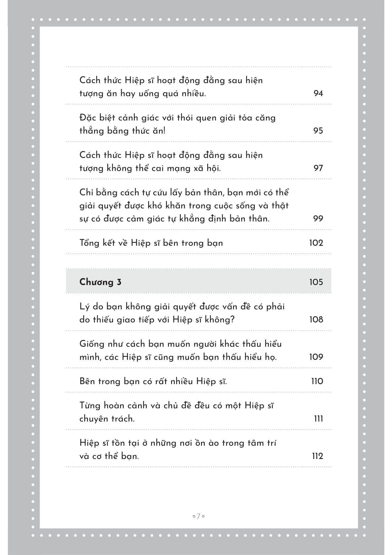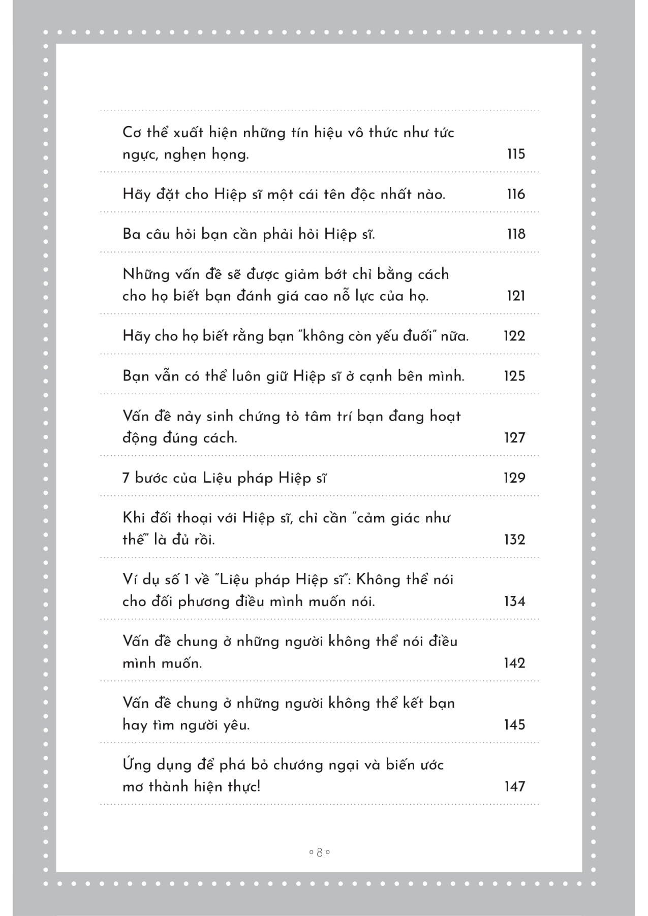 Thông qua “Liệu pháp Hiệp sĩ” gồm 7 bước thực hành đơn giản, bạn sẽ học cách đối thoại, đặt tên và công nhận phần tâm lý đang cố gắng bảo vệ mình. Cuốn sách cũng đưa ra nhiều ví dụ thực tế như khó khăn trong giao tiếp, tài chính, sự nghiệp… nhằm giúp người đọc dễ dàng áp dụng vào đời sống.
