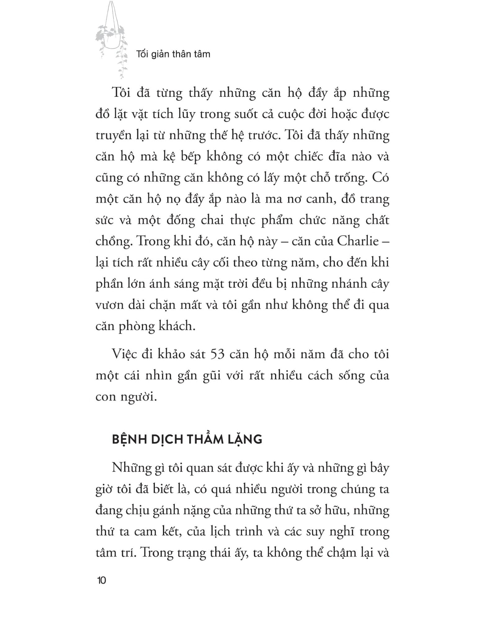 Thông qua cuốn sách của Erica Layne, hãy cùng khám phá cách áp dụng lối tư duy tối giản vào mọi khía cạnh của cuộc sống bằng cách thay đổi cách bạn nghĩ về nhà cửa, sự nghiệp, các mối quan hệ, gia đình và tiền bạc... Với triết lý thực tế, các bài tập và hoạt động đơn giản cùng các chiến lược dễ áp dụng để loại bỏ những phiền nhiễu và căng thẳng không cần thiết, đây là cuốn sách hướng dẫn cần thiết cho bất cứ ai muốn giải tỏa sự lộn xộn về thể chất, tinh thần và cảm xúc.