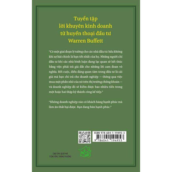 Sau khi trải qua dăm ba lần thị trường giá xuống trong suốt cuộc đời, Warren Buffett đã học được cách kiên trì đến cùng và bám chặt các nguyên tắc đầu tư của mình, trong khi những nhà đầu tư khác bán tháo hoặc cân nhắc lại chiến lược của họ. Cho nên, những nguyên tắc đã được thực tế kiểm chứng là yếu tố then chốt để trở thành nhà đầu tư thành công. Cuốn sách này không chỉ giúp bạn trở nên kỷ luật hơn, mà còn trở thành một nhà đầu tư DÀI HẠN, LẠC QUAN và SÁNG SUỐT hơn.
