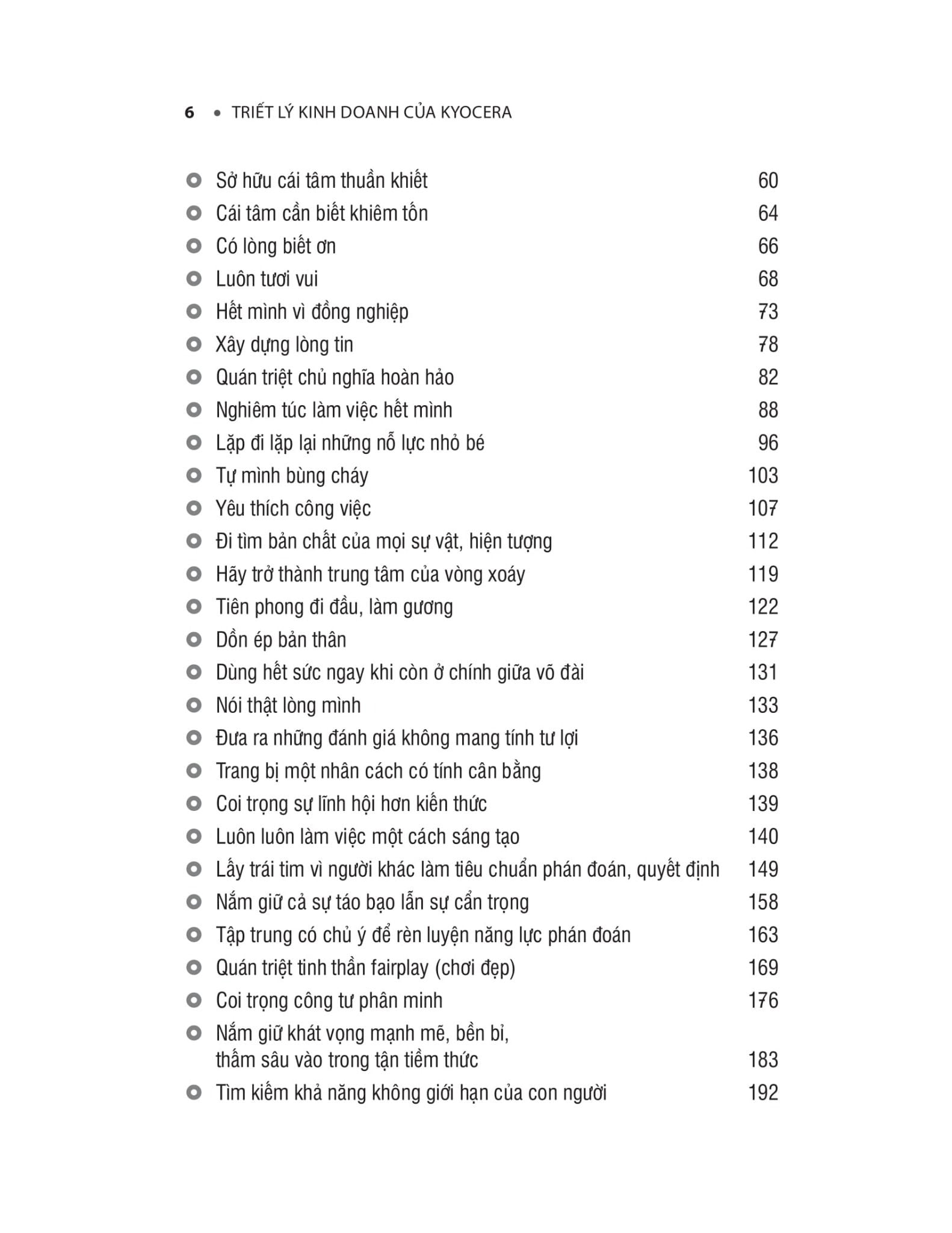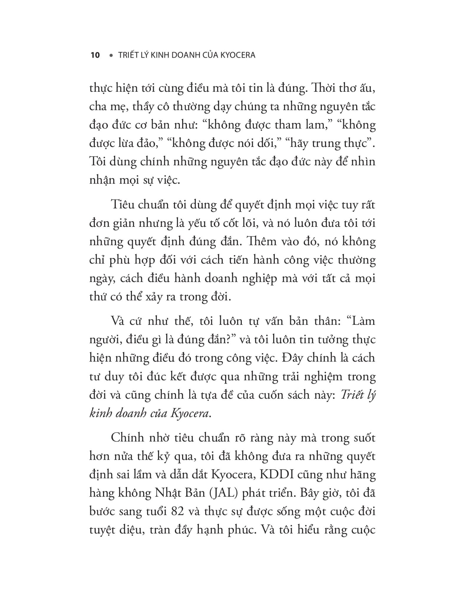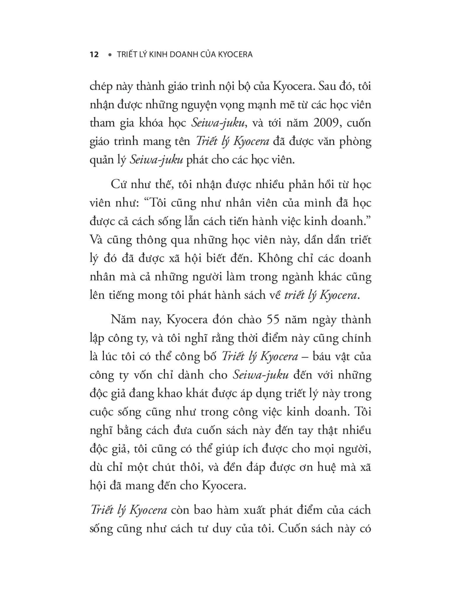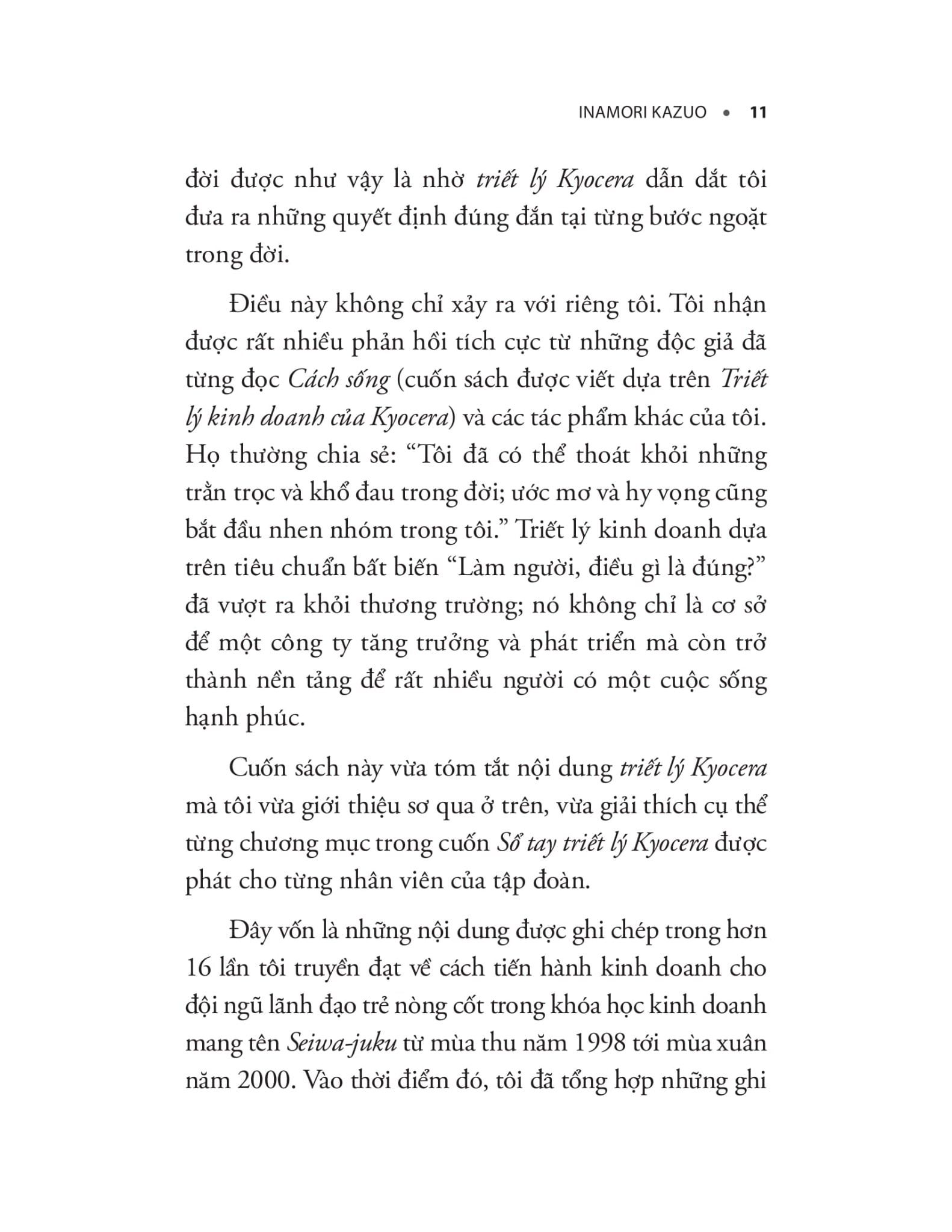 Điều gì tạo nên thành công cho một doanh nghiệp: nguồn vốn, nhân tài hay công nghệ? Theo doanh nhân huyền thoại Inamori Kazuo, câu trả lời không phải ba yếu tố kể trên mà là triết lý của người chủ doanh nghiệp. Thực tế đã minh chứng cho tư tưởng của ông. Bằng việc tạo nên một triết lý kinh doanh cho chính bản thân và công ty, Inamori Kazuo đã đưa Kyocera từ một doanh nghiệp nhỏ trở thành một tập đoàn công nghệ cao đa quốc gia hùng mạnh. Ông đã tóm tắt lại những tư tưởng của mình trong cuốn Triết lý kinh doanh của Kyocera.