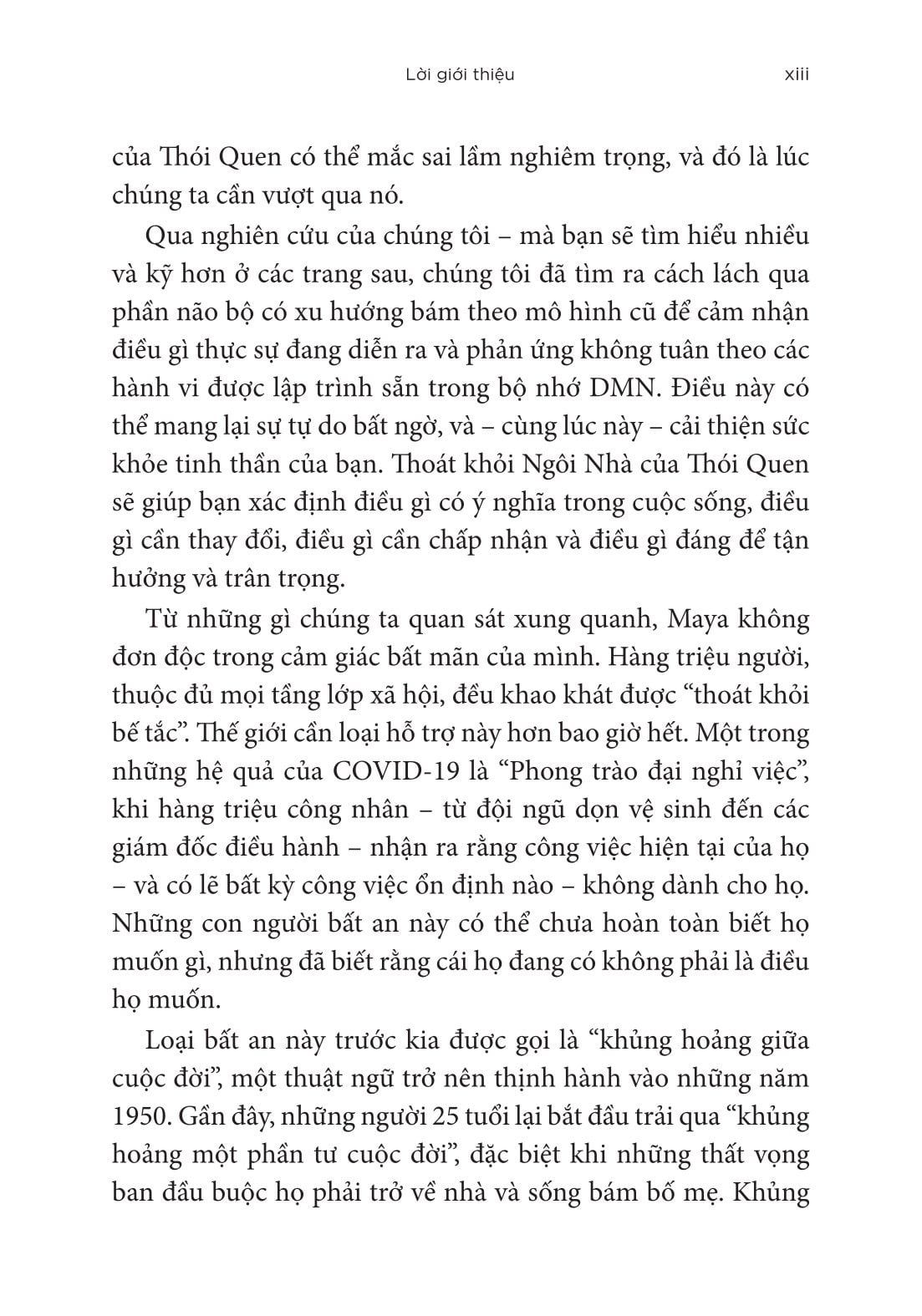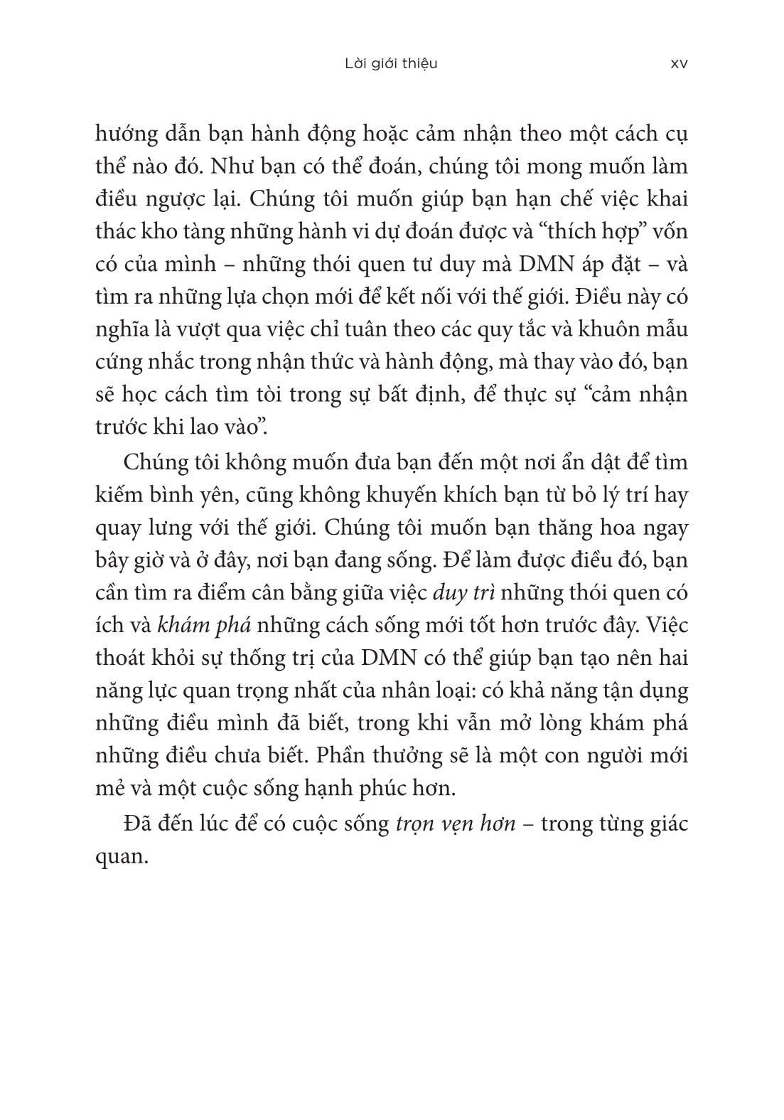 Trong cuốn sách “Trọn vẹn từng giác quan”, nhà thần kinh học Norman Farb và nhà tâm lý lâm sàng Zindel Segal giải thích rằng bộ não có hai mạng lưới: mạng lưới giải quyết vấn đề nhanh chóng (thói quen) và mạng lưới cảm giác, dành riêng cho những hiểu biết mới mẻ. Bằng cách điều chỉnh vào những cảm giác mới và hàng ngày - từ cảm giác bàn chân trên đường phố đông đúc đến tiếng chim hót trong công viên - chúng ta có thể kích hoạt mạng lưới cảm giác. Khi căng thẳng hoặc bị mắc kẹt, chúng ta có thể tạm dừng để chú ý và cảm nhận thế giới sôi nổi, sống động xung quanh mình và tăng cường khả năng phục hồi, sức khỏe, hạnh phúc và sự sáng tạo bất kể ở nơi nào, ngay thời điểm hiện tại.