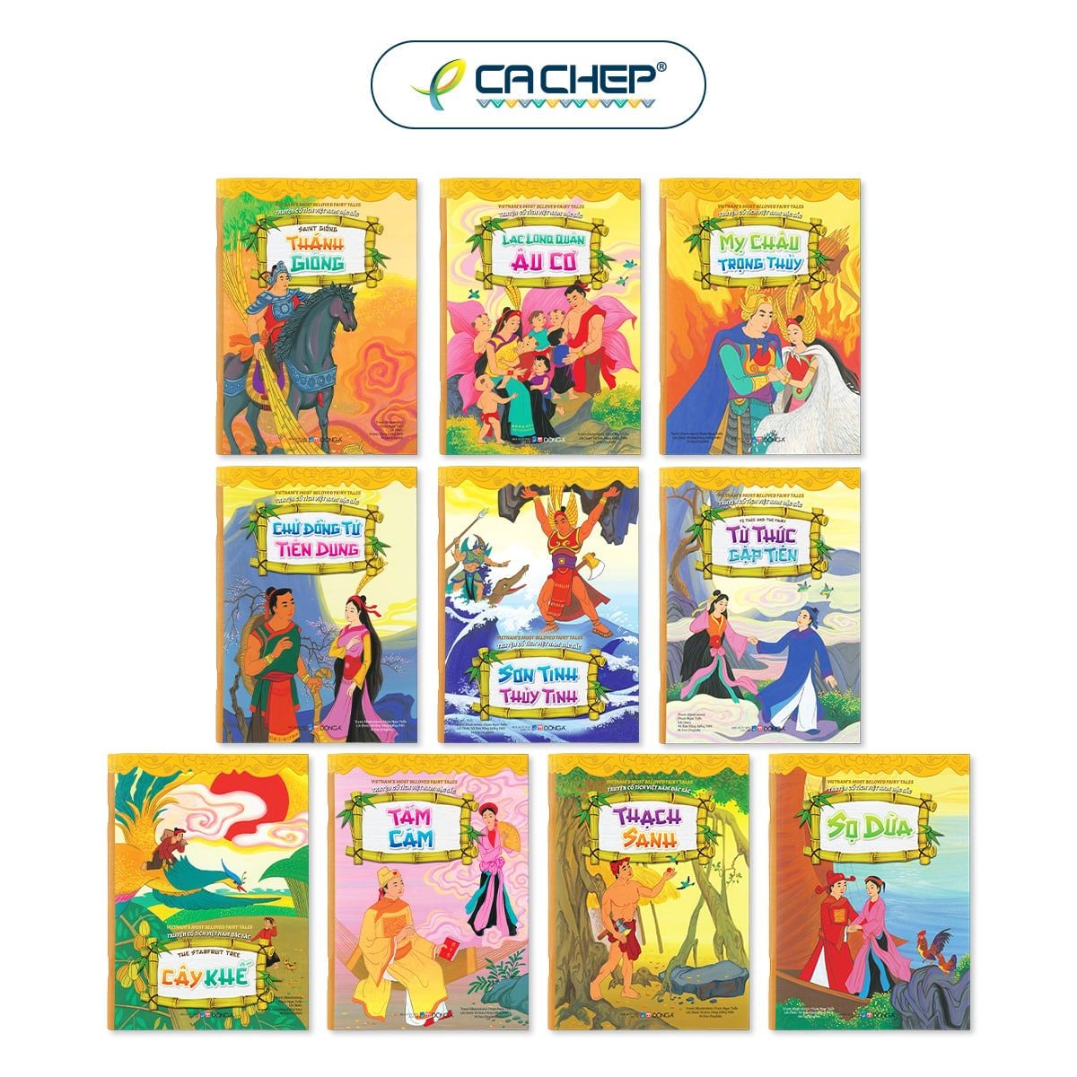 Bộ sách tuyển chọn kỹ lưỡng 10 câu chuyện đặc sắc nhất trong kho tàng cổ tích Việt Nam: Lạc Long Quân Âu Cơ, Chử Đồng Tử Tiên Dung, Mỵ Châu Trọng Thủy, Sơn Tinh Thủy Tinh, Tấm Cám, Từ Thức gặp Tiên, Thạch Sanh, Thánh Gióng, Sọ Dừa, Cây khế.