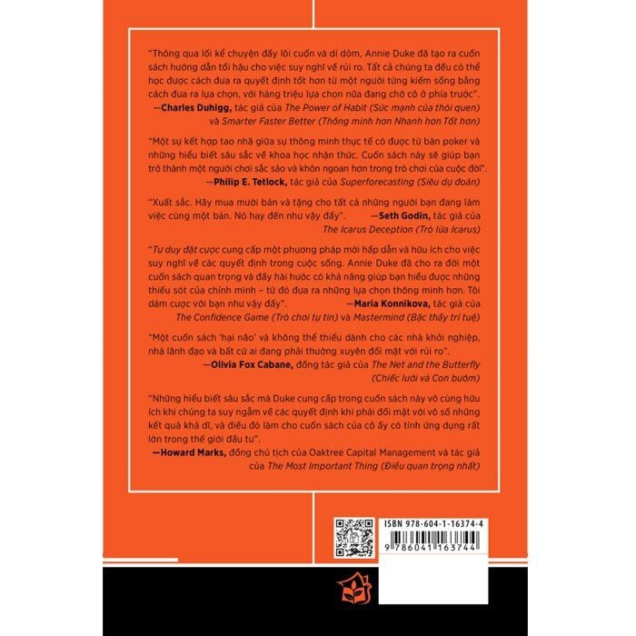 Tư duy đặt cược sử dụng rất nhiều ví dụ hấp dẫn để minh họa cho những công cụ hùng mạnh (và gần như không liên quan gì đến toán học) mà bất cứ ai cũng có thể áp dụng được. Nó sẽ giúp bạn nhận diện những sai lầm may mắn và những khoảnh khắc sáng chói xui xẻo để bạn sẽ ít có nguy cơ bị chiếm lĩnh bởi những cảm xúc phản ứng, thành kiến theo phản xạ và thói quen tiêu cực. Và nó sẽ giúp bạn chiêu mộ được sự giúp đỡ của đồng nghiệp, bạn bè và gia đình trên cuộc hành trình tìm kiếm thành công đang tiếp diễn của mình. Cho dù tương lai có ra sao đi nữa thì bạn cũng sẽ trở nên tự tin hơn, điềm tĩnh hơn và bao dung với bản thân mình hơn khi đối mặt với nó. Không phải lúc nào bạn cũng đưa ra được những quyết định đúng đắn, nhưng bạn sẽ có được một lợi thế lớn hơn rất nhiều so với những người đặt cược bằng cảm giác thay vì bằng trí óc.