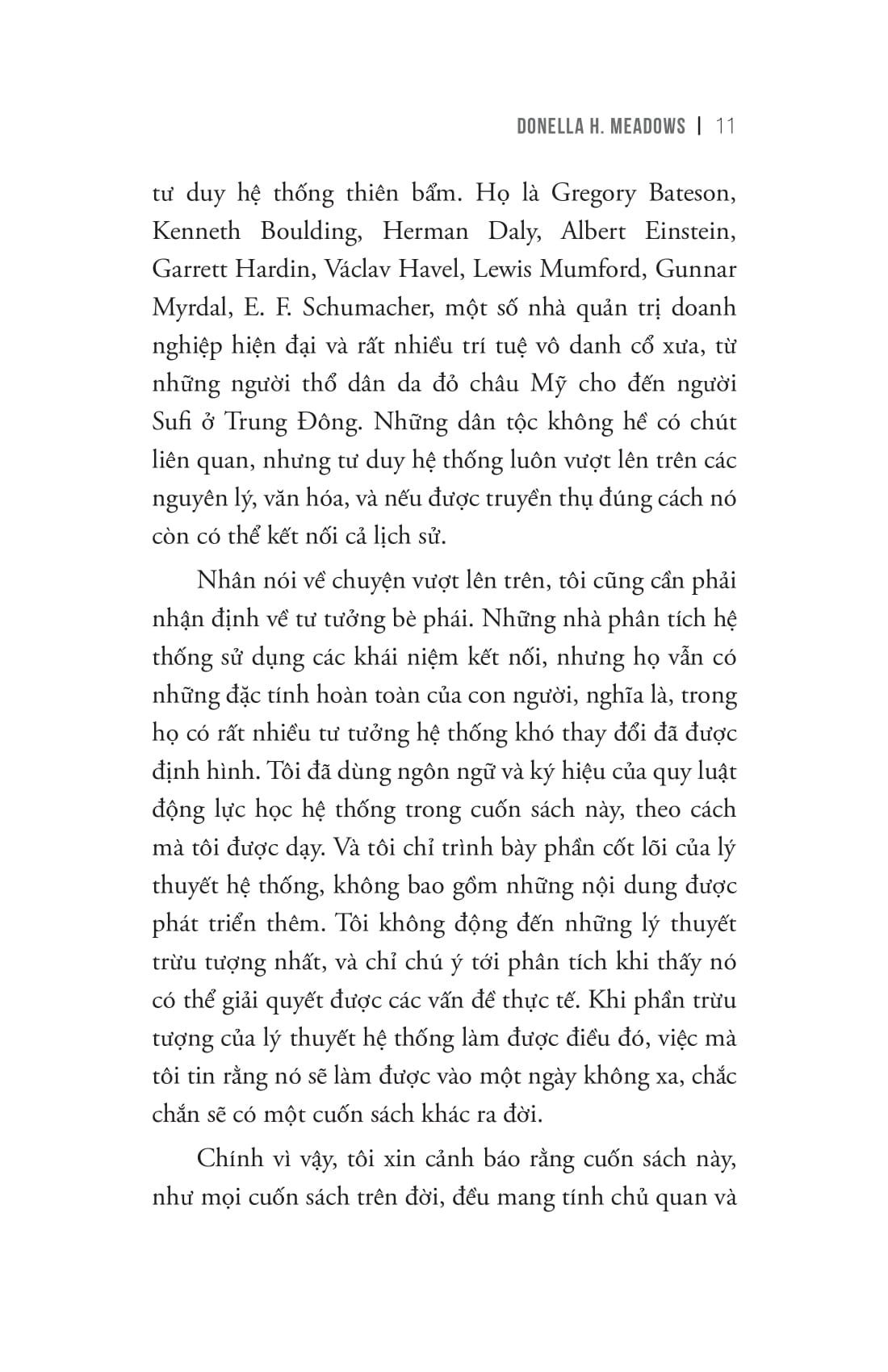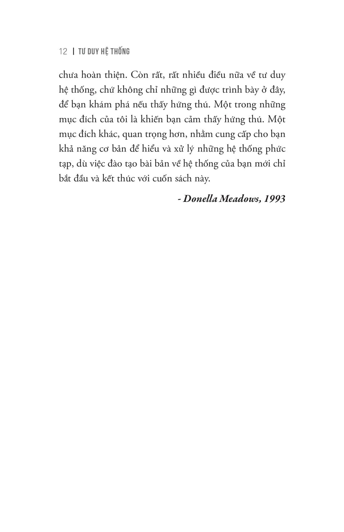 “Và khi Trái đất trở nên hỗn độn hơn, đông đúc hơn, liên kết hơn, phụ thuộc lẫn nhau hơn, biến đổi nhanh hơn, việc nắm được lối tư duy từ góc nhìn hệ thống cho phép chúng ta thấu hiểu về cả hệ thống, đồng thời rèn luyện khả năng hiểu cục bộ, nhìn thấy mối liên kết giữa các sự vật sự việc, đưa ra câu hỏi “nếu như” về những hành vi có thể diễn ra trong tương lai, cho ta sức sáng tạo và lòng dũng cảm để tái thiết hệ thống.”