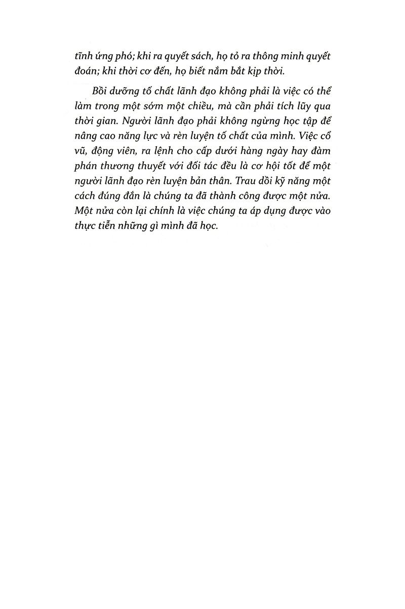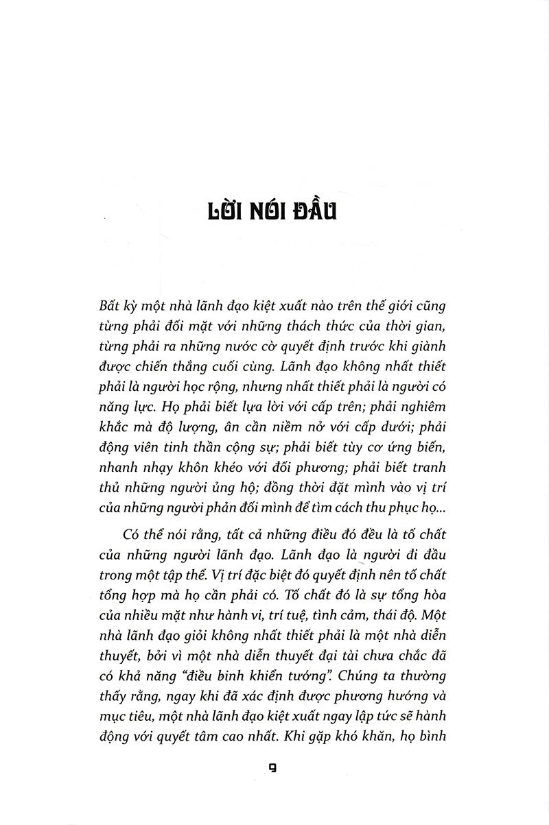 Đọc “Thuật lãnh đạo”, bạn sẽ thấy, với bất kỳ một nhà lãnh đạo kiệt xuất nào trên thế giới cũng từng phải đối mặt với những thách thức của thời gian, từng phải ra những nước cờ quyết định trước khi giành được chiến thắng cuối cùng. Lãnh đạo không nhất thiết phải là người học rộng, nhưng nhất thiết phải là người có năng lực. Là người của công chúng, họ luôn luôn bận rộn. Họ phải cung kính lắng nghe, biết lựa lời cấp trên; phải nghiêm khắc mà độ lượng, ân cần niềm nở với cấp dưới; phải động viên tinh thần cộng sự để cùng đoàn kết một lòng; phải biết tùy cơ ứng biến, nhanh nhạy khôn khéo với đối phương; phải biết tranh thủ những người ủng hộ; phải biết đặt mình vào vị trí của những người phản đối mình để tìm cách thu phục họ…