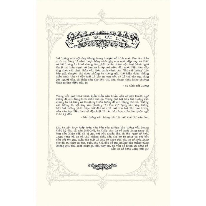 "Cải lương như một ông Gióng trong truyện cổ tích nước Nam, âm thầm sinh ra, lặng lẽ sinh hoạt, bỗng chốc gặp con nước dịp may và thời cơ, cải lương ăn khỏe chóng lớn, phát triển thành một loại hình ca diễn mạnh mẽ lan ra khắp mọi miền đất nước Việt Nam, đáp ứng được cái tinh thần cải tiến canh cánh của "đời cải lương" lúc bấy giờ, chuyển tải được những tư tưởng mới, thể hiện được những điều canh tân và đặc biệt là làm no con mắt, đã lỗ tai của mọi tầng lớp người dân, từ nông thôn cho đến thị dân, đang khát khao thưởng thức những điều mới lạ" - trích Sự tích cải lương