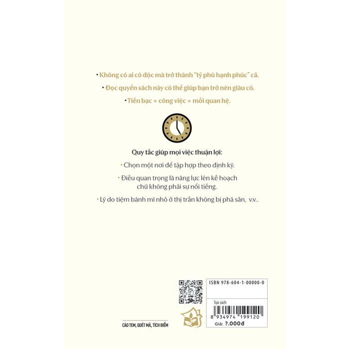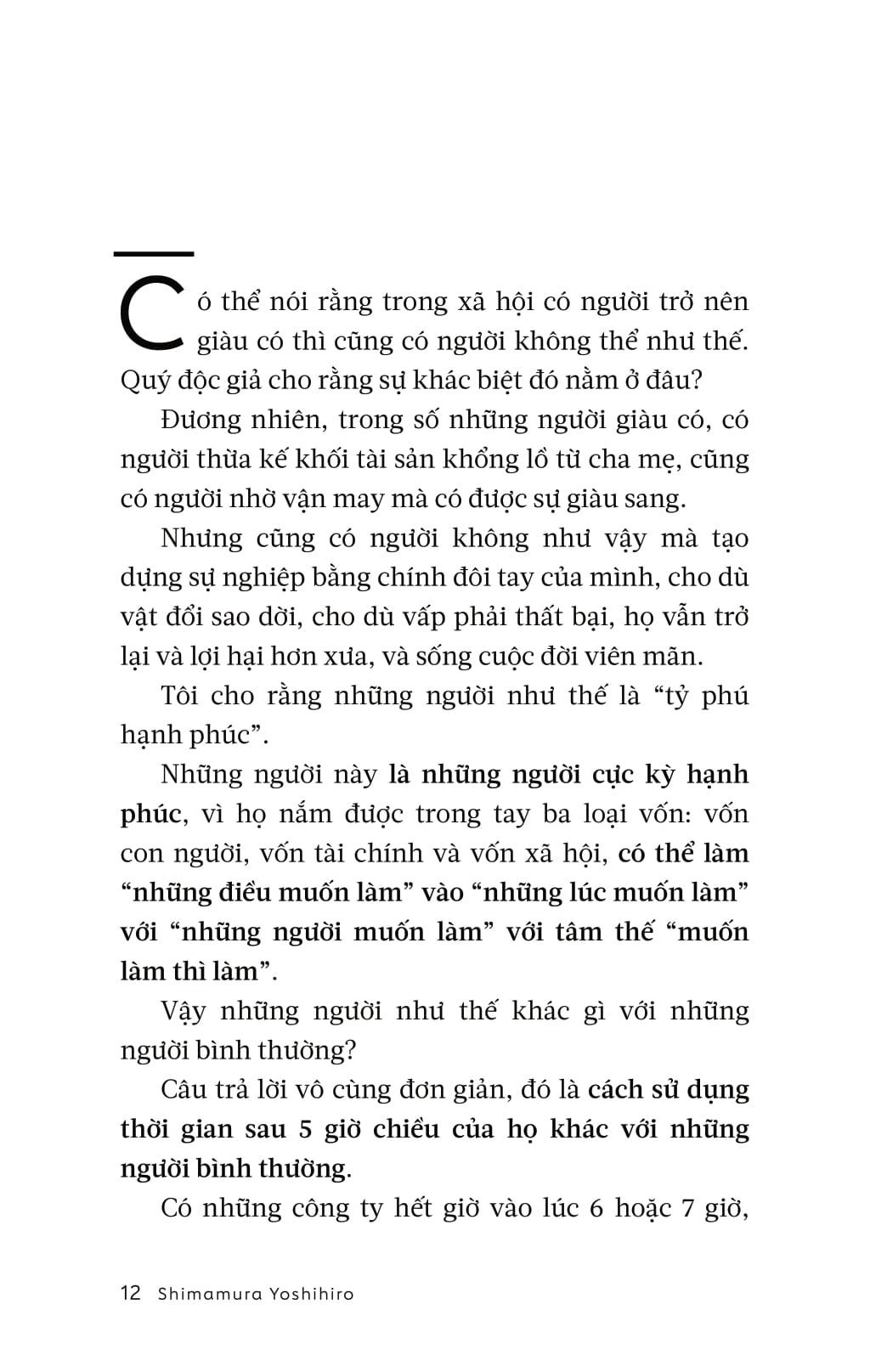 Tác giả Shimamura Yoshihiro khởi nghiệp khi còn thiếu niên và hiện là một doanh nhân, nhà đầu tư và nhà sản xuất phim. Ông đã làm việc với hơn 1.500 người thành đạt, học được “những điều mà các tỷ phú hạnh phúc coi trọng”, rồi chia sẻ bí quyết thành công với độc giả. Đây là cuốn sách cần thiết cho dân công sở, giúp họ có thêm vốn sống, mối quan hệ và nguồn vốn.