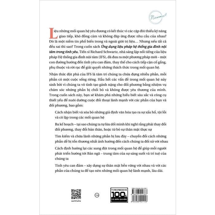 Có phải các mối quan hệ yêu đương kết thúc vì các cặp đôi thiếu kỹ năng giao tiếp, khó đồng cảm và không đáp ứng được nhu cầu của nhau? Đó là một niềm tin phổ biến trong và ngoài giới trị liệu… Nhưng nếu tất cả đều sai thì sao? Trong cuốn sách Ứng dụng liệu pháp hệ thống gia đình nội tâm trong tình yêu, Tiến sĩ Richard Schwartz, nhà sáng lập nổi tiếng của liệu pháp Hệ thống gia đình nội tâm (IFS), đã đưa ra một phương pháp mới - một con đường hướng đến tình yêu can đảm, thay thế cho cách tiếp cận cố gắng, phụ thuộc và rời rạc để giải quyết những thách thức trong mối quan hệ.