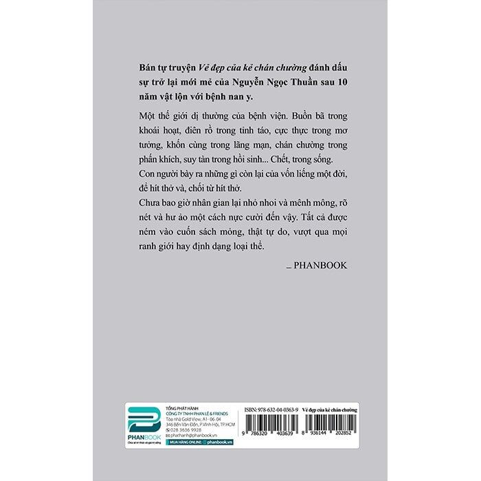 Vẻ đẹp của kẻ chán chường là tác phẩm đánh dấu sự trở lại đầy mới mẻ của nhà văn Nguyễn Ngọc Thuần sau gần 10 năm vắng bóng trên văn đàn, chiến đấu với bệnh nan y. Được viết bằng thể loại bán tự truyện, với không gian chủ yếu ở bệnh viện, với những câu từ giàu chất thơ, buồn bã trong khoái hoạt, điên rồ trong tỉnh táo, cực thực trong mơ tưởng, khốn cùng trong lãng mạn,… cuốn sách mang đến một thể nghiệm văn chương độc đáo, vừa quyến rũ vừa ma mị, vừa huyễn hoặc vừa hiện thực. Con người bày ra những gì còn lại của vốn liếng một đời, để hít thở và chối từ hít thở.