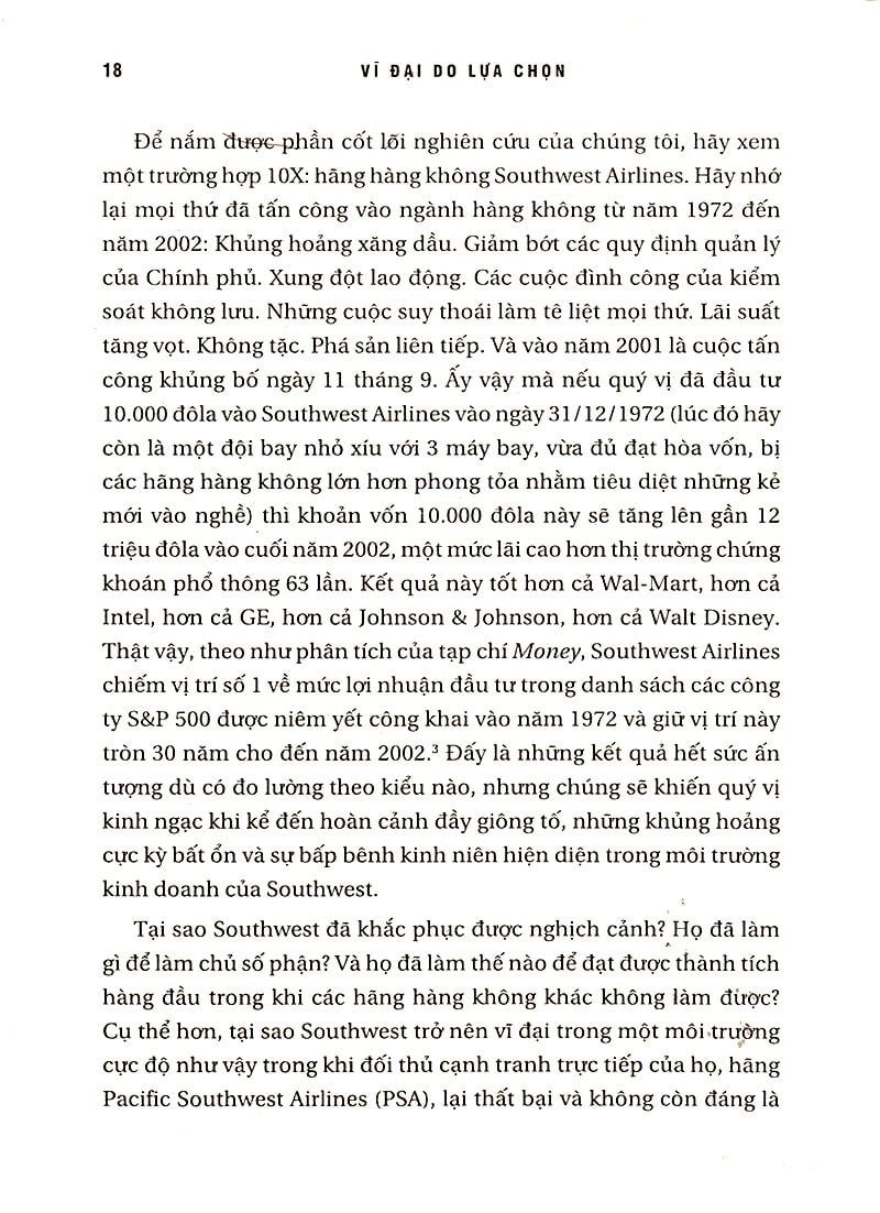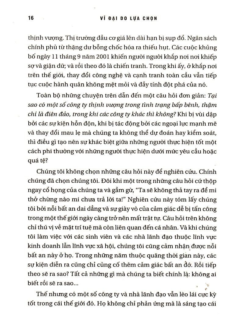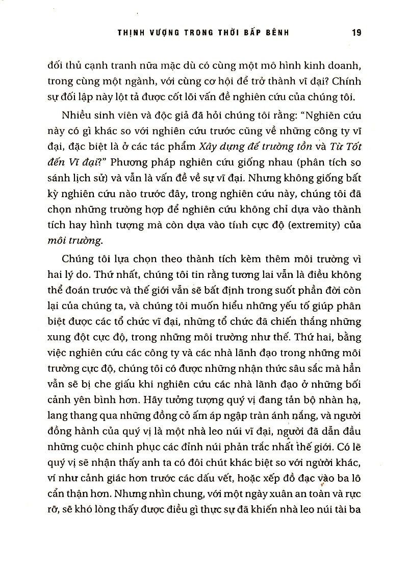 Và kết quả nghiên cứu sẽ gây bất ngờ cho nhiều nhà lãnh đạo các tổ chức đọc quyển sách này: Những nhà lãnh đạo của các công ty vĩ đại không sáng tạo hơn, không có tầm nhìn xa hơn, không có cá tính hơn, không có vận may hơn, không thích tìm kiếm rủi ro hơn, không anh hùng hơn, và không có khuynh hướng thực hiện những nước cờ lớn, táo bạo hơn. Nhưng họ đã lèo lái được công ty họ qua những lúc khó khăn để luôn trường tồn, bởi vì họ sống và làm việc theo ba yếu tố cân bằng nhau: kiên định với nguyên tắc, sáng tạo theo kinh nghiệm và biết sợ hãi một cách hữu ích.