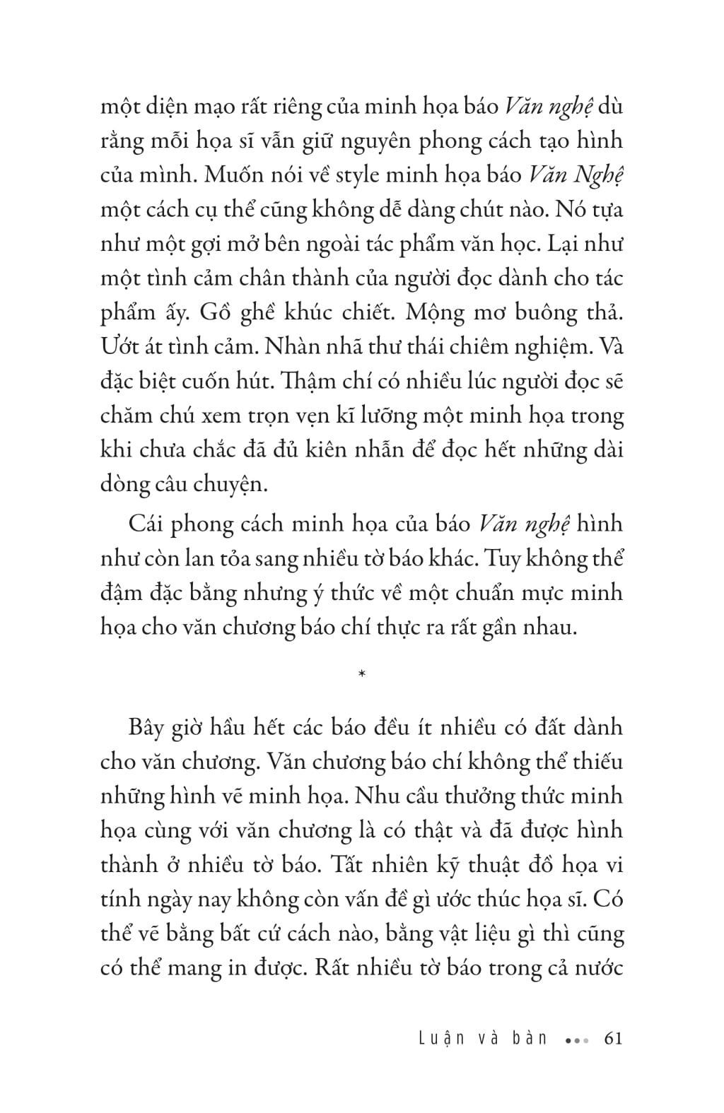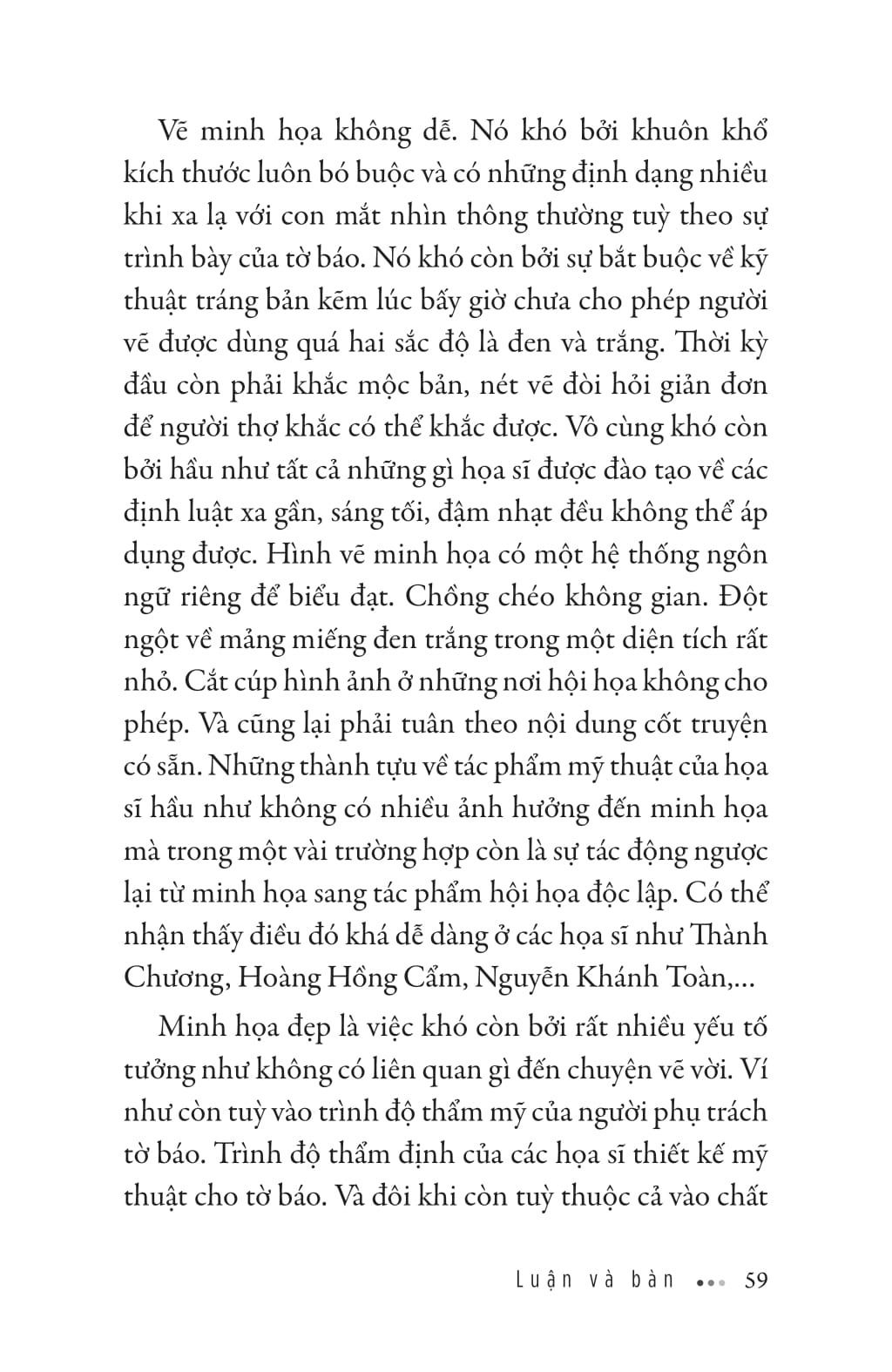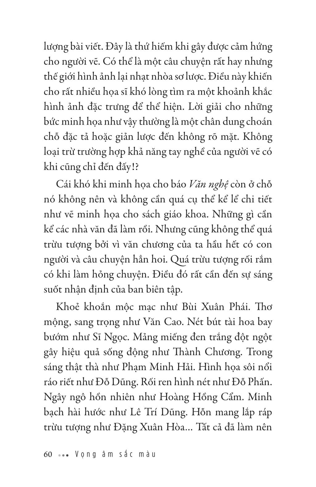 Trong cuốn sách, người đọc được gặp gỡ những bậc thầy Mỹ thuật Đông Dương, những họa sĩ lừng danh, tác phẩm kinh điển của mỹ thuật Việt Nam đương đại . Cùng với đó là hàng loạt vấn đề về thường thức nghệ thuật, giáo dục nghệ thuật, cho đến vấn nạn tranh giả-tranh thật, nghệ thuật và hàng hóa,... được soi chiếu qua mắt nhìn độc đáo, lão luyện của một họa sỹ tên tuổi.
