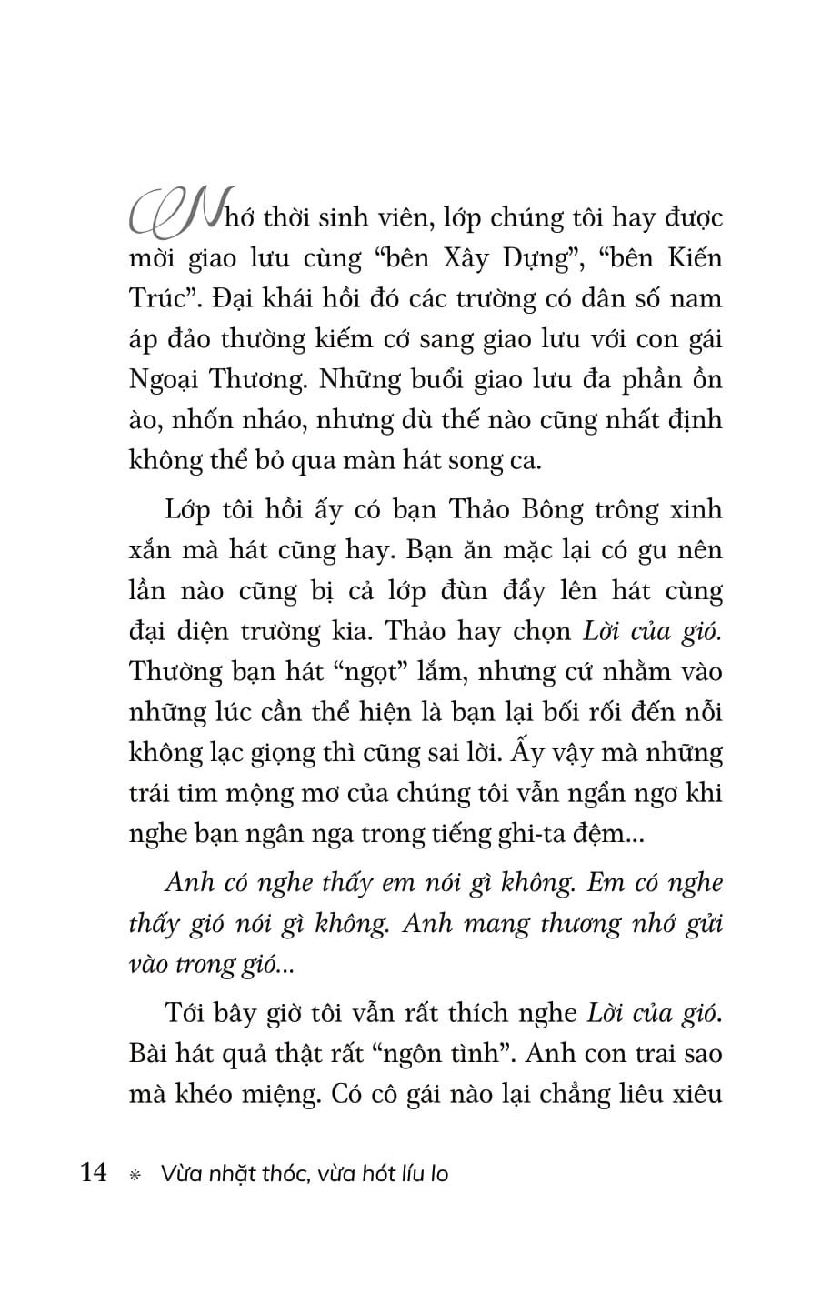 Là một người đã trải qua những va vấp, và nếm trải những vị đắng đầu tiên, tác giả Vân Nguyễn trong cuốn sách “Vừa nhặt thóc vừa hát líu lo” tự nhắc mình cảnh giác với những giấc mơ. “Ta bỏ lại chúng trong căn phòng kín, tập sống thực tế, để tránh những “nỗi đau vỡ mộng”. Cho tới một ngày, cô nhớ ra mình vẫn luôn giữ chìa khóa để bước vào căn phòng nơi chứa những hạt mầm bé nhỏ.