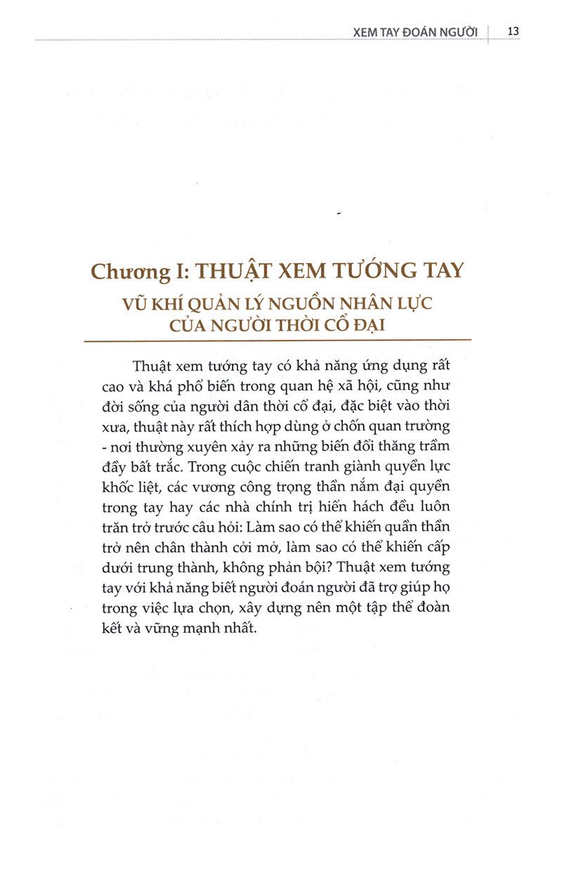 Thuật tướng tay là hòn ngọc quý hiếm trong văn hóa truyền thống Trung Hoa. Lý luận hoàn chỉnh và phán đoán tinh tế trong thuyết tướng tay luôn nhận được sự quan tâm, chú ý của đông đảo mọi người. Từ xưa tới nay, xem tướng tay được ứng dụng rộng rãi trong mọi mặt đời sống xã hội. Đặc biệt, người xưa còn biết thông qua thuật tướng tay để tìm kiếm ra những nhân tài ưu tú.Xem tay đoán người hội tụ những tinh hoa của thuật xem tướng tay, dung hòa những nét tinh tuý của phương đông và phương tây, bao hàm các kỹ năng phân tích tướng tay thịnh hành thời hiện đại, chỉ ra những bí mật ẩn giấu bên trong tướng tay, giúp bạn đọc tự mình khám phá được tính cách, vận thế mọi mặt về sức khỏe, hôn nhân, sự nghiệp thông qua việc quan sát kết cấu, hình dạng, màu sắc và đường vân của bàn tay.